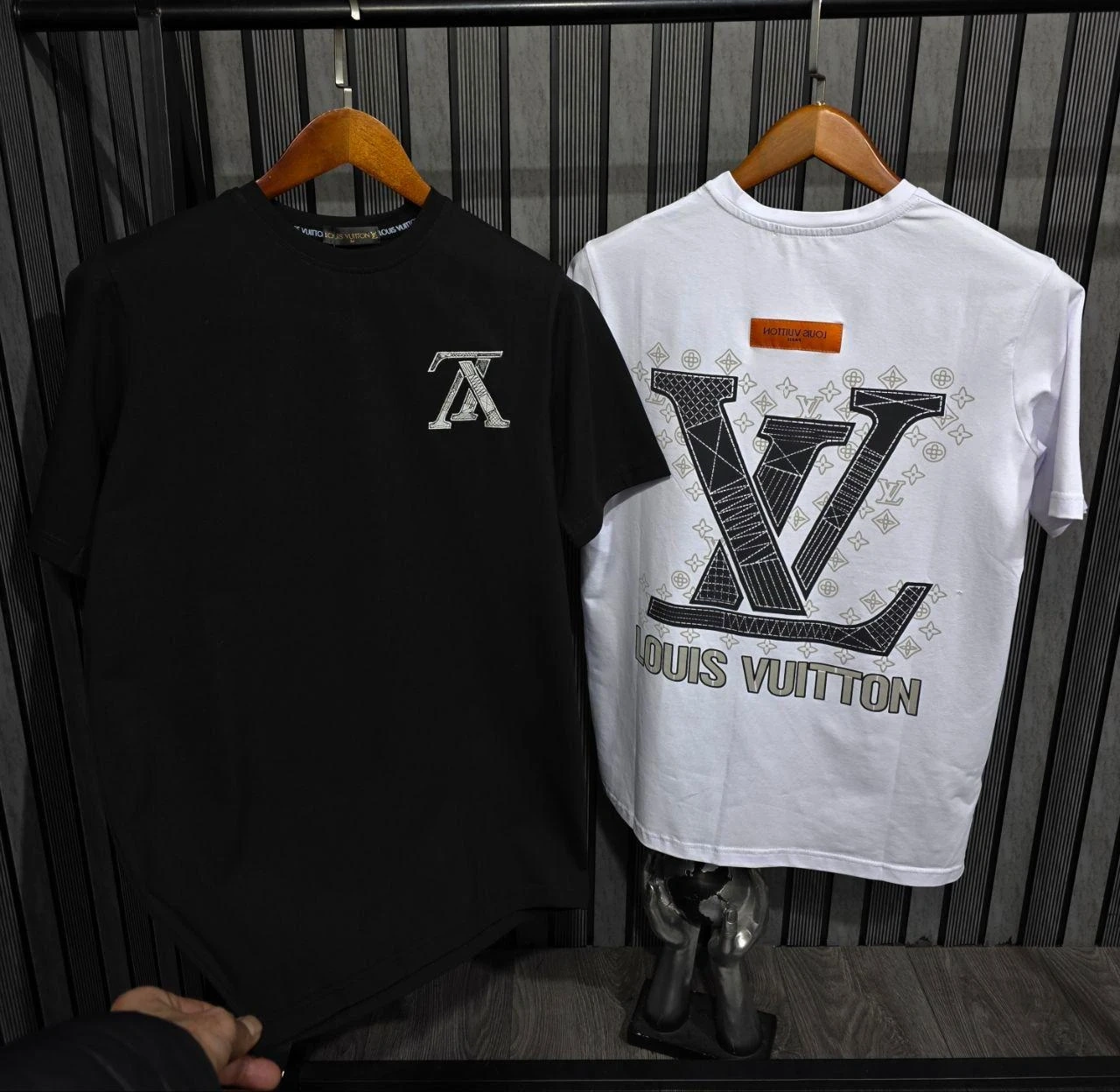 Stylish Louis Vuitton graphic t-shirts. One black and one white, both featuring the iconic LV monogram design. Cotton material for comfort.