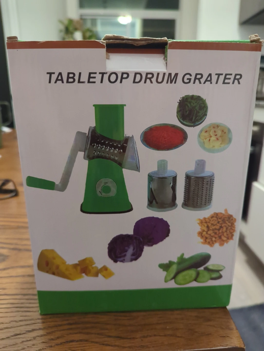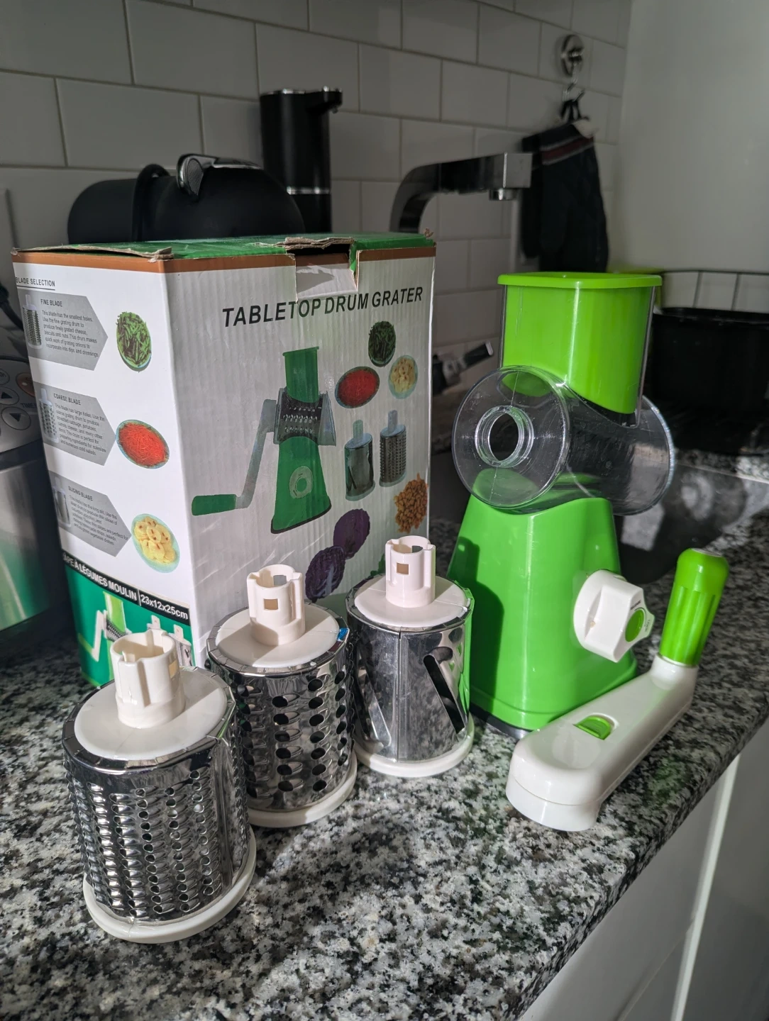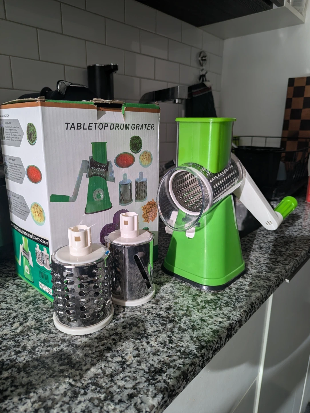 This tabletop drum grater is green and comes with interchangeable blades. It's perfect for shredding vegetables, cheese, and more. Includes the original box and all components.