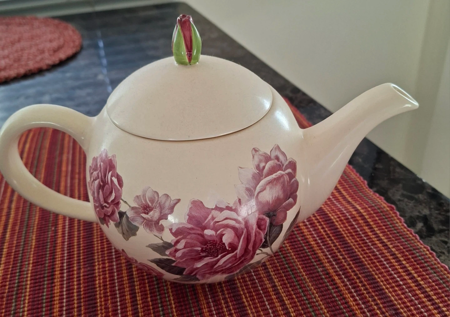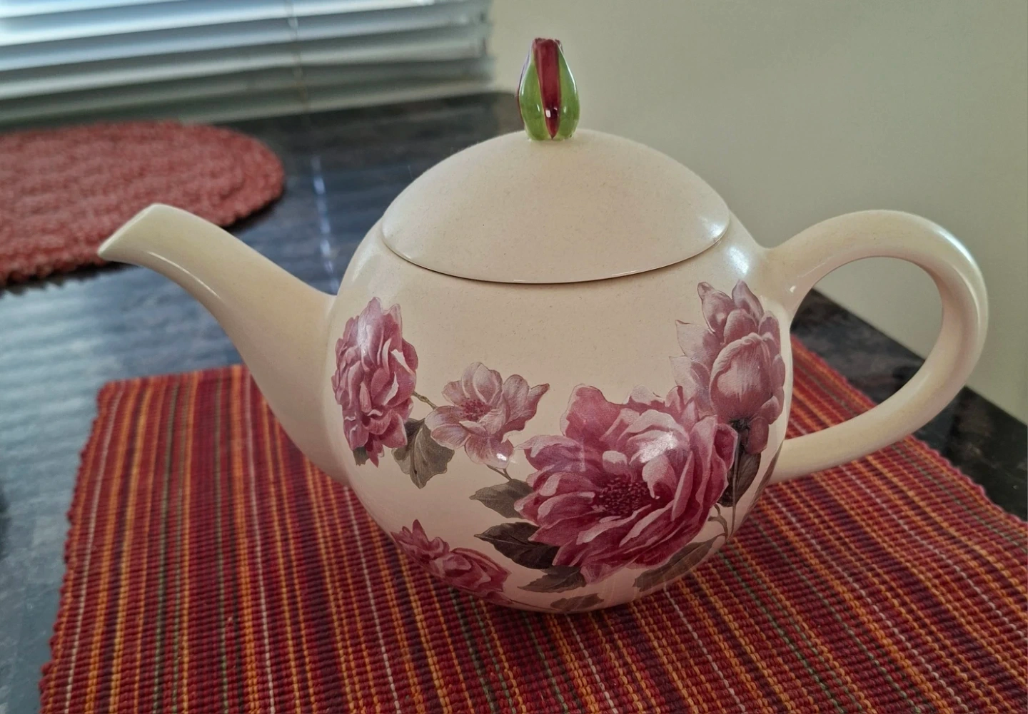 Cream-coloured teapot with a floral design featuring pink roses and a green bud on the lid. Ceramic material. A lovely piece and still can be used for making tea.