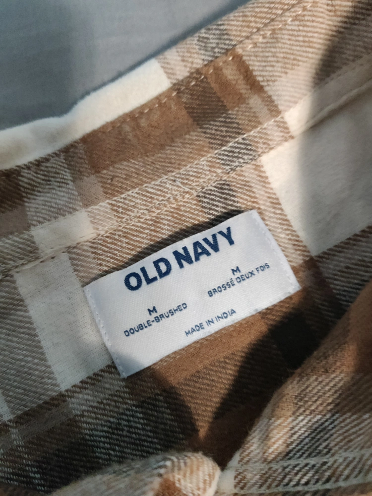 Cozy Old Navy flannel shirt in a brown and white plaid pattern! It's a size M and features a double-brushed texture for extra softness