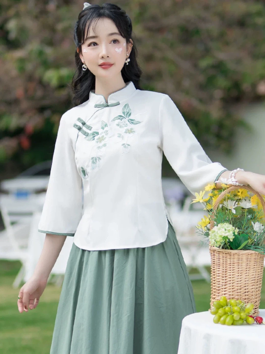 • Top: Adopts a classic stand-up collar with an asymmetric frog button placket; the frog buttons are in a matching grey-green hue that echoes the floral embroidery on the body. It has seven-quarter sleeves with contrast color binding at the cuffs, and the delicate embroidery pattern of green leaves and white flowers exudes an elegant and fresh vibe.