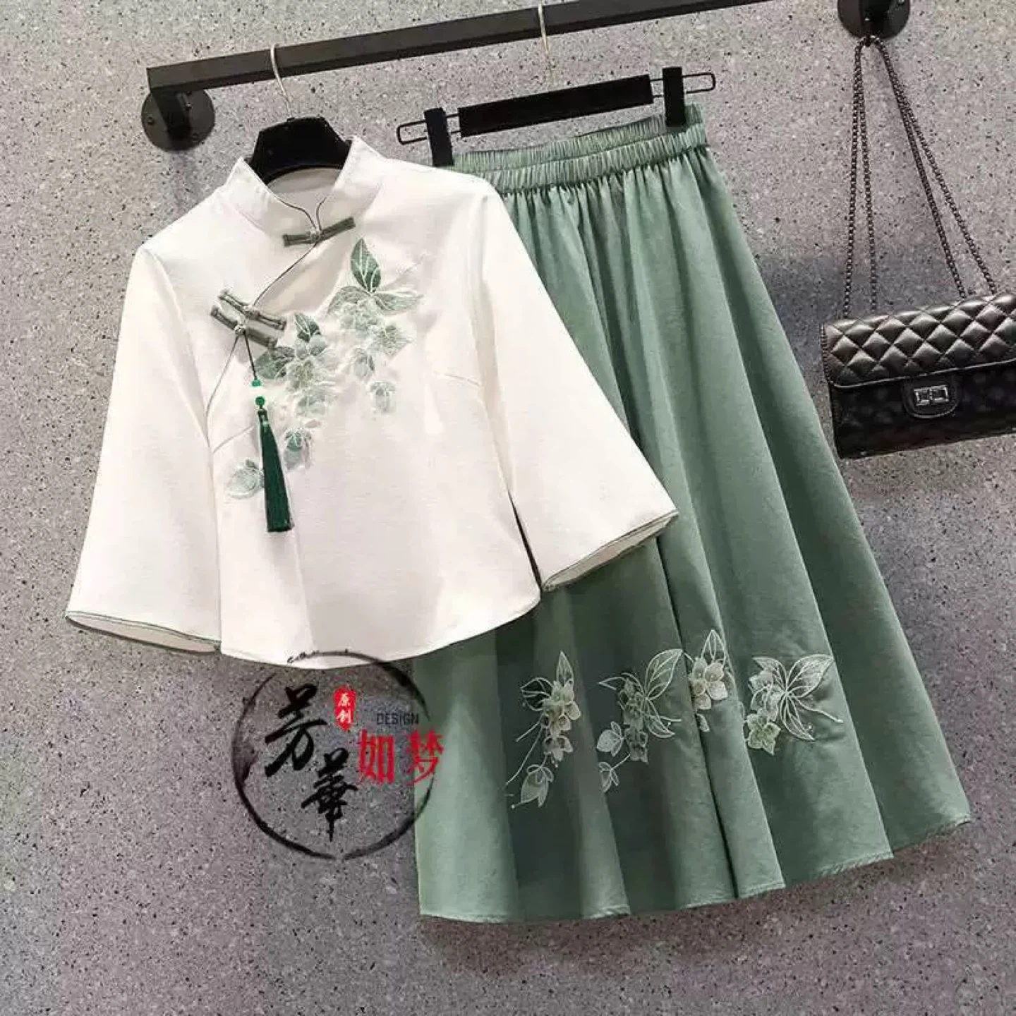 This is a modern Chinese Tang suit two-piece set combining a modified cheongsam-style top and a midi skirt, featuring a blend of Republican-era cheongsam elements and contemporary casual design, ideal for daily light Chinese style wear.
