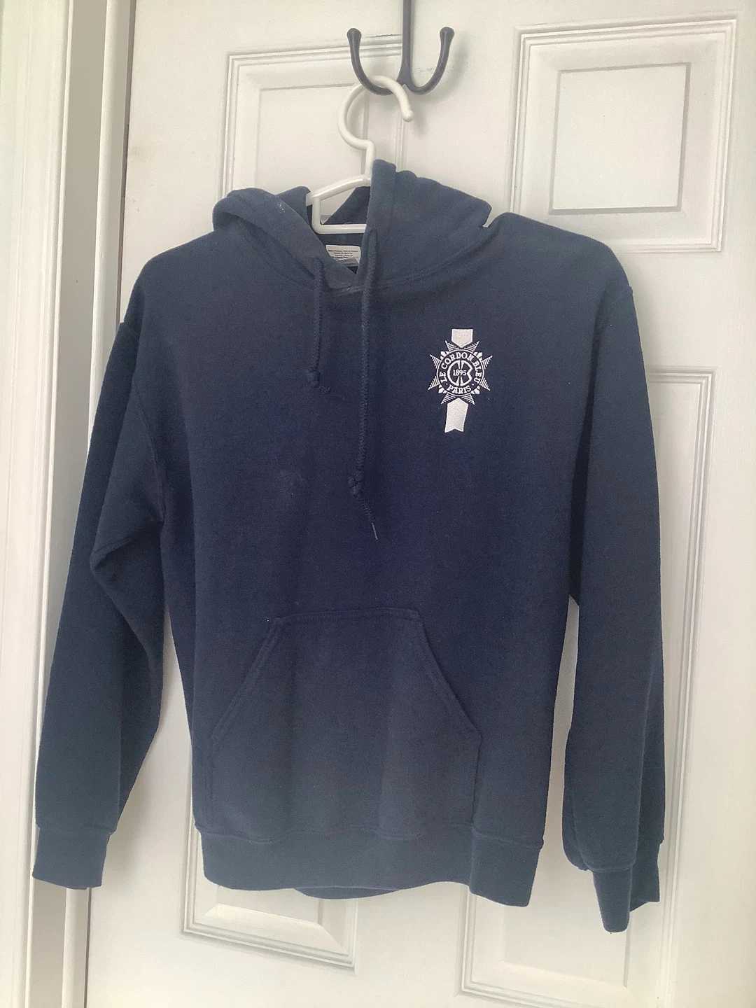 Navy blue Gildan Heavy Blend hoodie with Cordon Bleu Paris logo. It's a size small. Made of 50% cotton and 50% polyester.