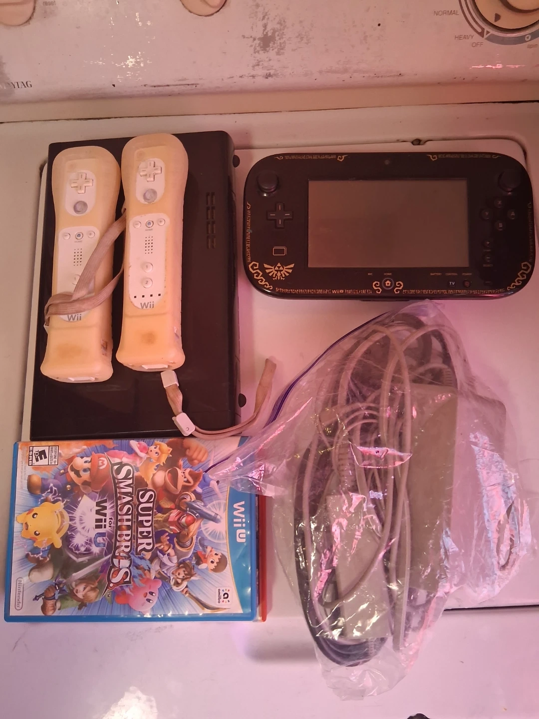 This bundle includes a black Nintendo Wii U console and two white Wii remotes. It also comes with the Super Smash Bros. for Wii U game. All cables and necessary accessories are included. This is a great package for any Nintendo fan!