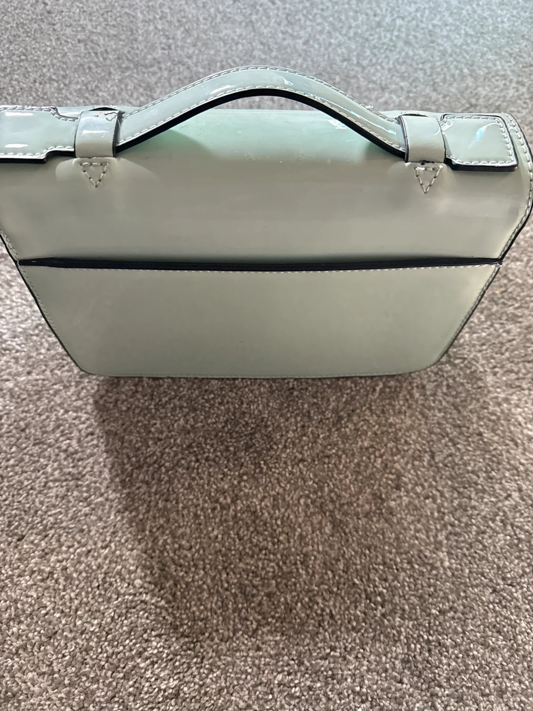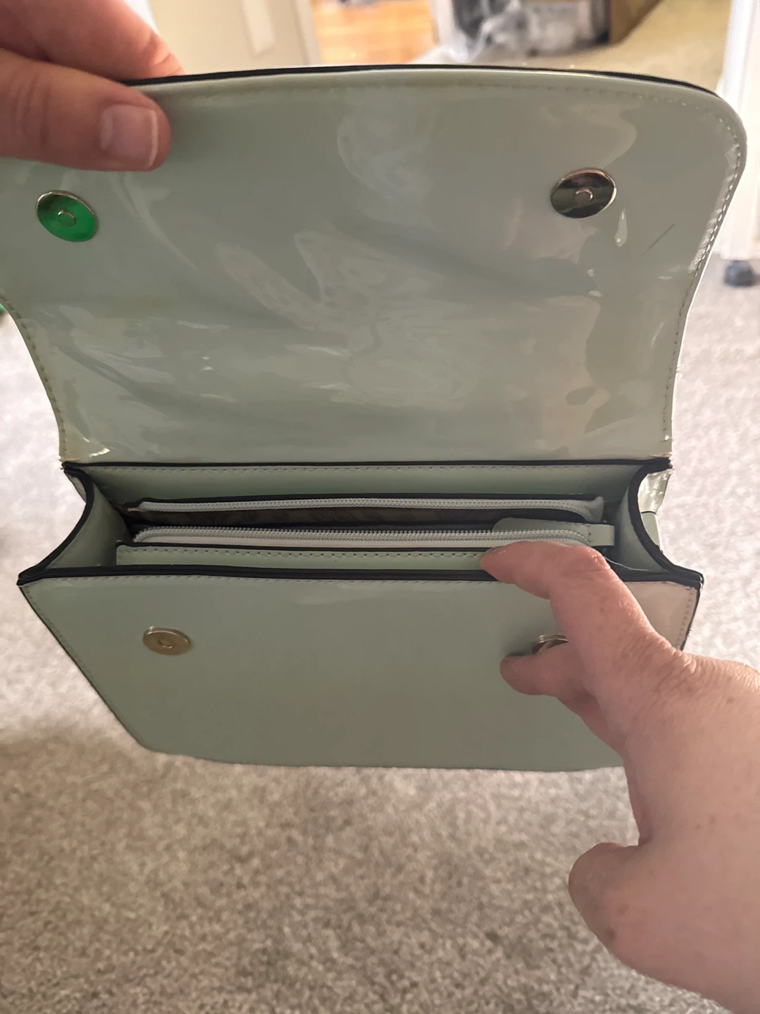 A stylish mint green handbag with a glossy green finish. It has a structured design with a top handle and a flap closure. Inside, there's a zippered compartment for secure storage. The inside is like a Paisley pattern.