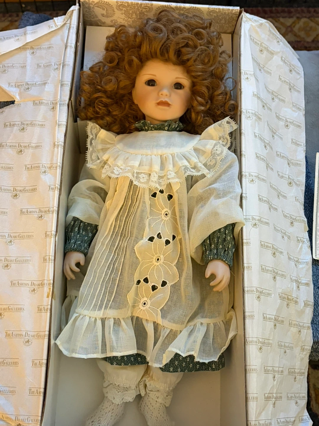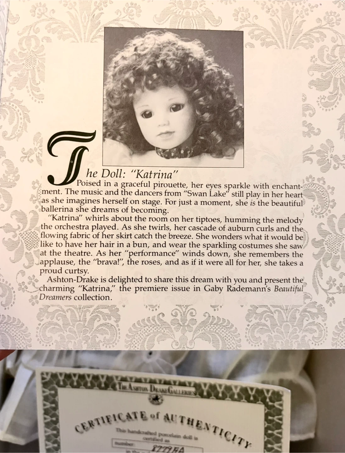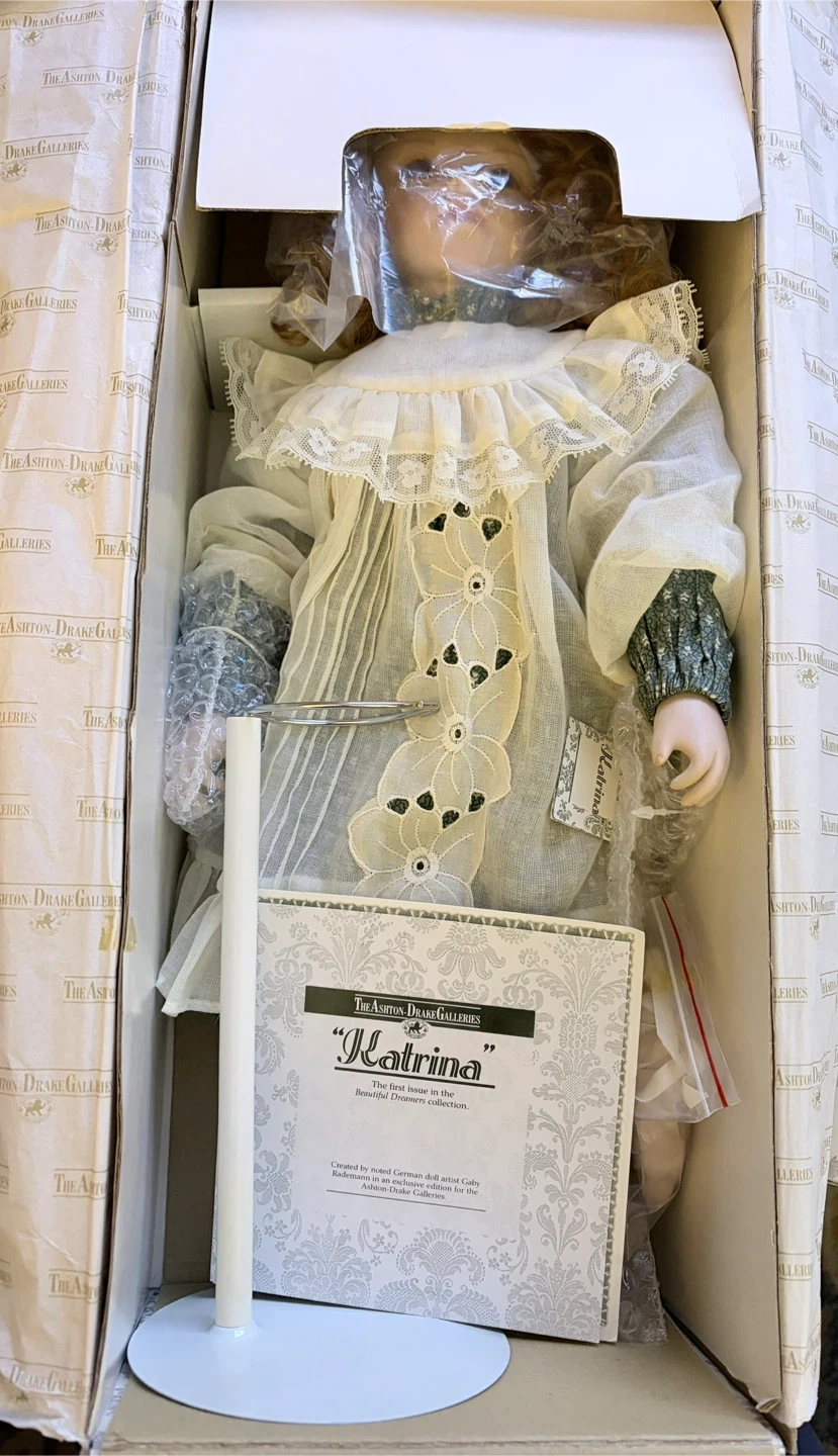 Limited edition #8779 of vintage porcelain doll “Katrina” circa 1991 by The Ashton-Drake Galleries. Was the premiere issue of world renowned German doll artist, Gaby Rademann’s Beautiful Dreamers Collection.