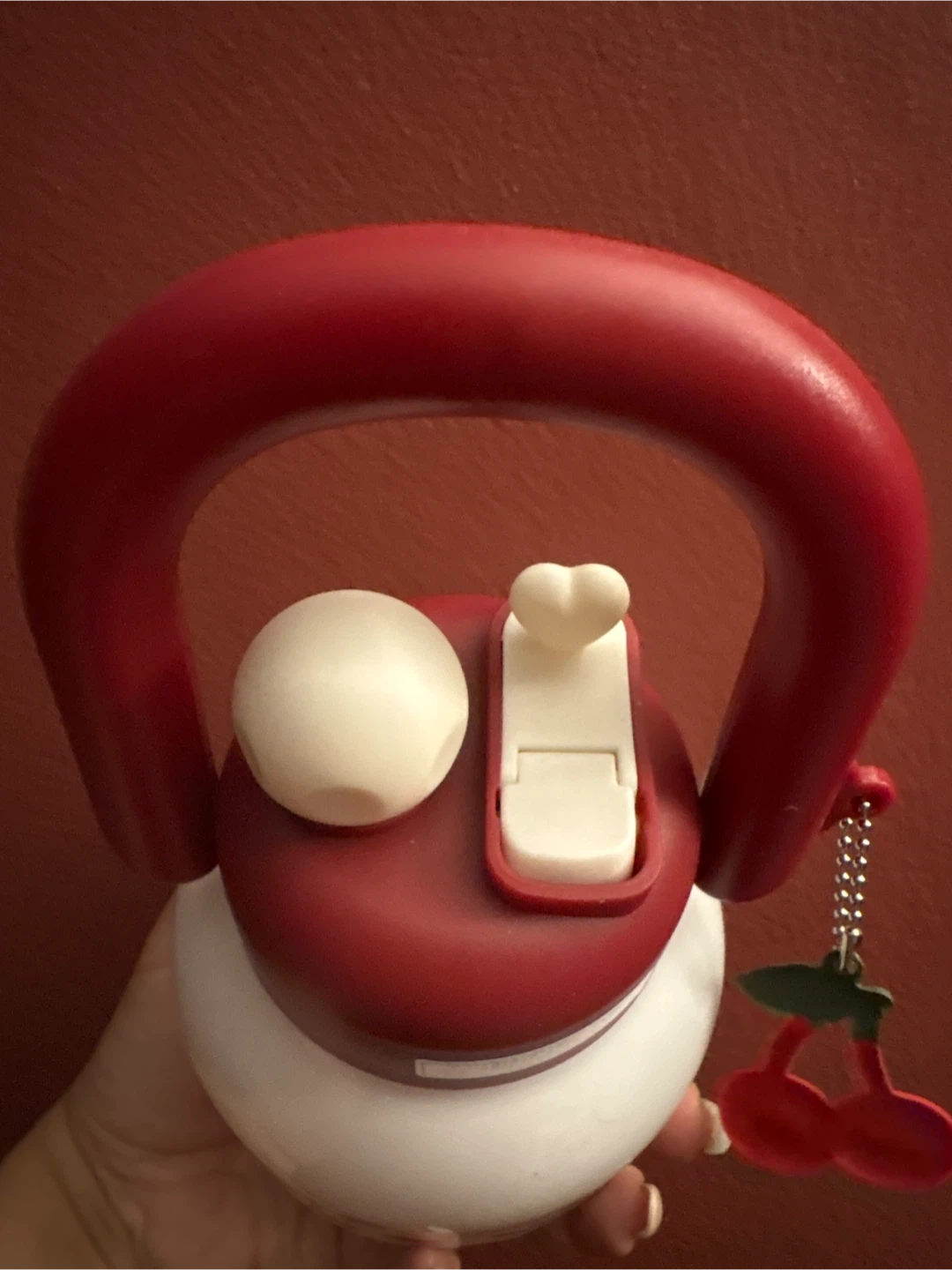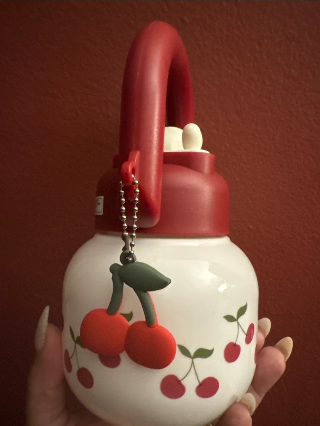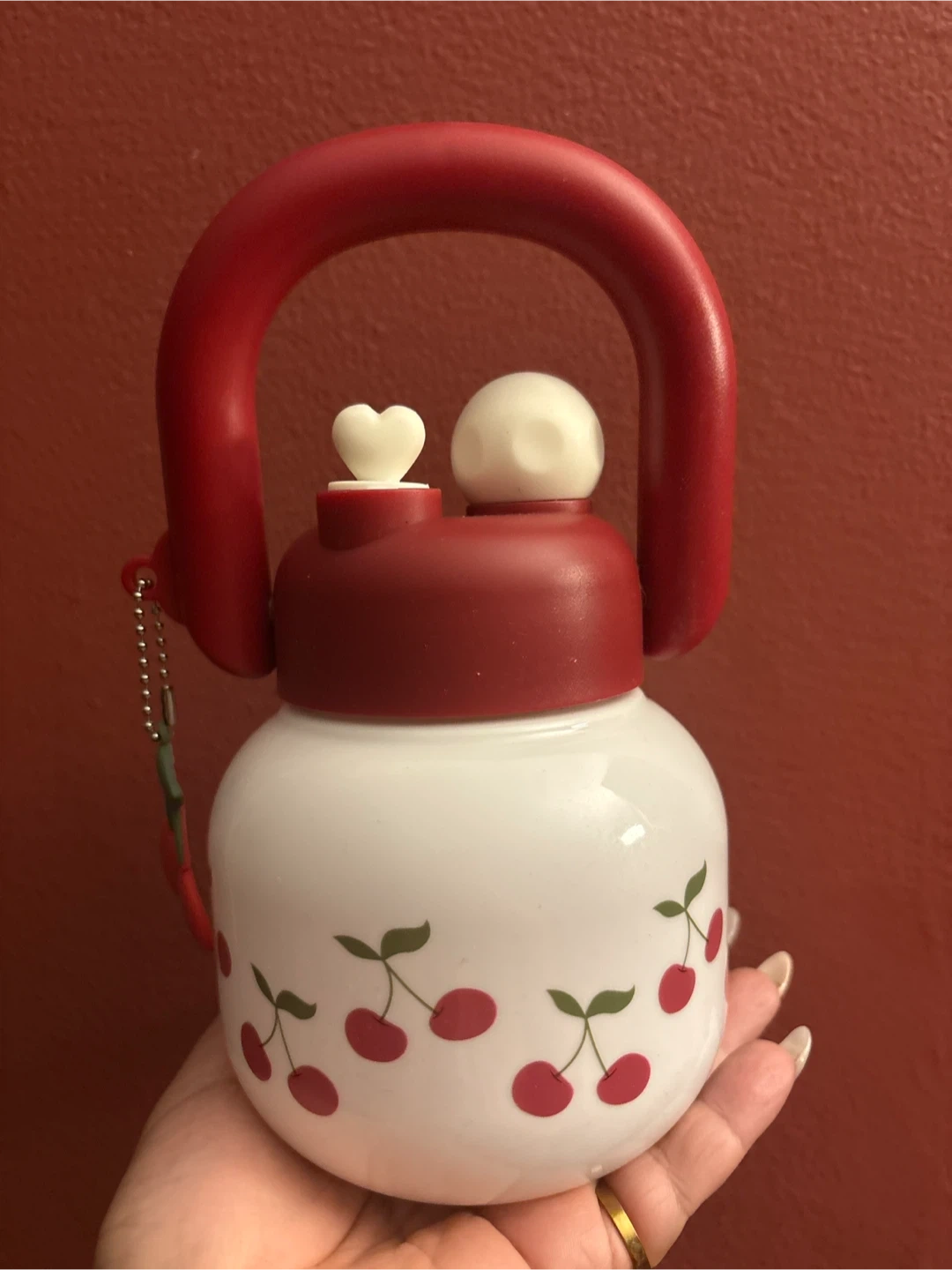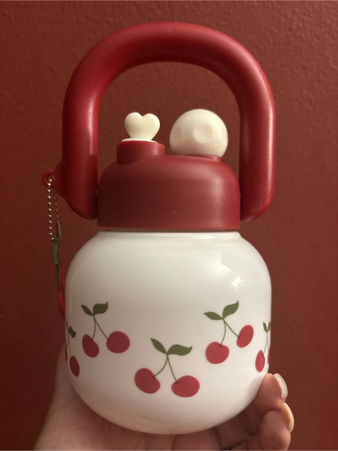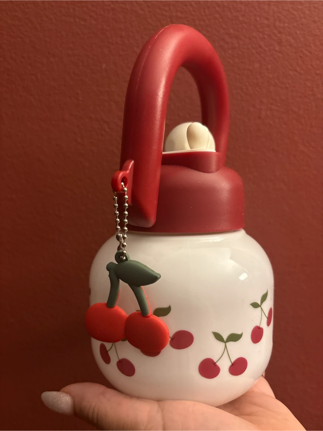 This charming water bottle features a playful cherry design. It has a secure flip-top lid and a convenient carrying handle. Perfect for staying hydrated on the go! New