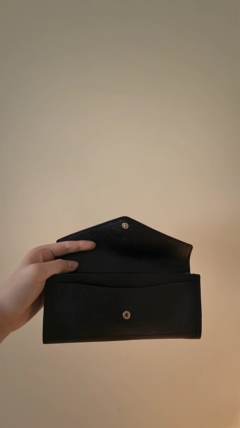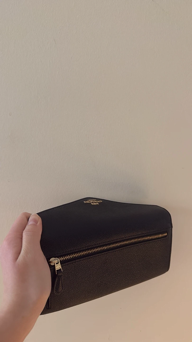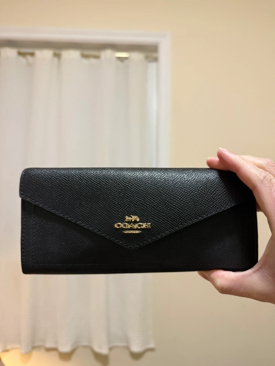 This is a black Coach wallet with a textured leather exterior and a gold-tone Coach logo. It features a snap closure and a zippered pocket. Multiple card slots and compartments are inside.