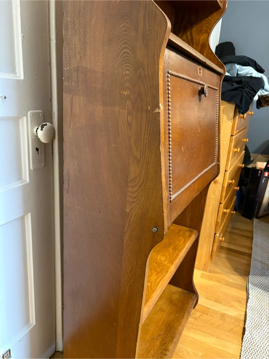 This vintage secretary desk is made of solid wood and features multiple shelves for storage. It has a drop-down writing surface with a small keyhole for security. This piece offers a charming way to organize your space. It has scratches and marks but good working condition. Measurements: 60”* 27”*11.5” (inches)