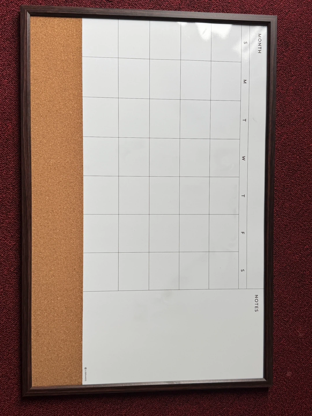65Here's a U Brands monthly calendar featuring a combination of cork and whiteboard surfaces! It's perfect for keeping track of your schedule and jotting down notes. The frame is a nice dark brown colour. Great for any home or office space