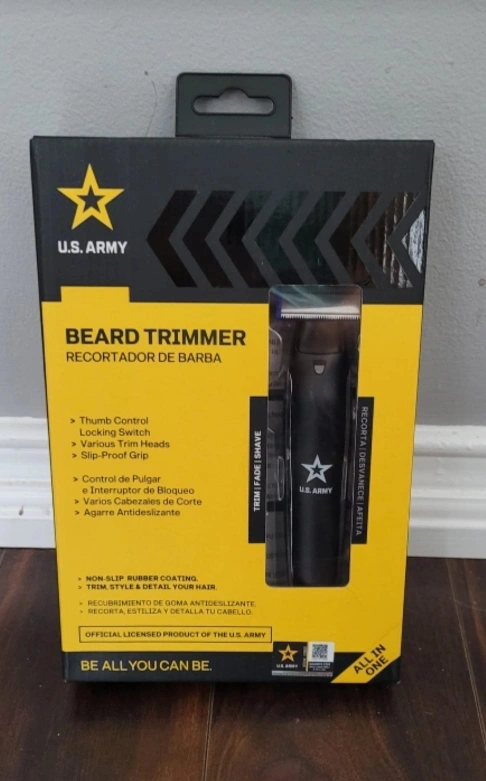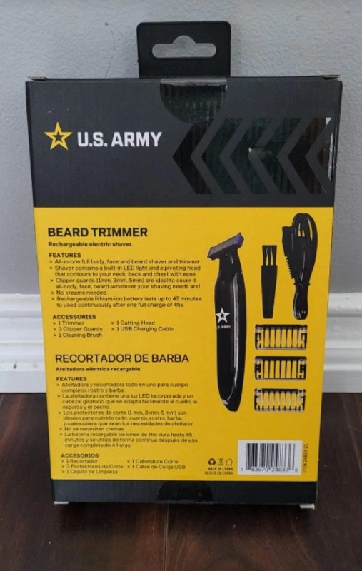 Keep your beard looking sharp with this U.S. Army beard trimmer! It's a rechargeable electric shaver that's perfect for full body, face, and beard trimming. The shaver contains a built-in LED light and a pivoting head. Accessories include: 1 cutting head, 3 trimmer guards (1mm, 3mm, 5mm), 1 cleaning brush, and 1 USB charging cable. The rechargeable battery lasts up to 45 minutes after a full charge. Box included!