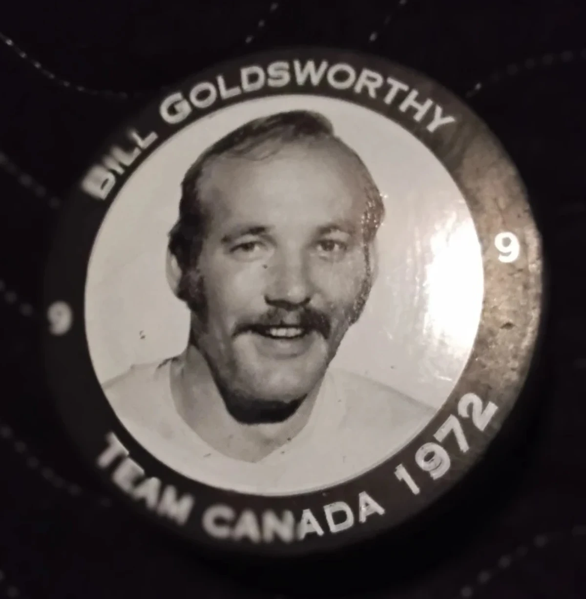 Selling a Team Canada 1972 hockey puck. It features the 'Team of the Century' logo on one side and a portrait of Bill Goldsworthy on the other. A great piece for any hockey fan!
