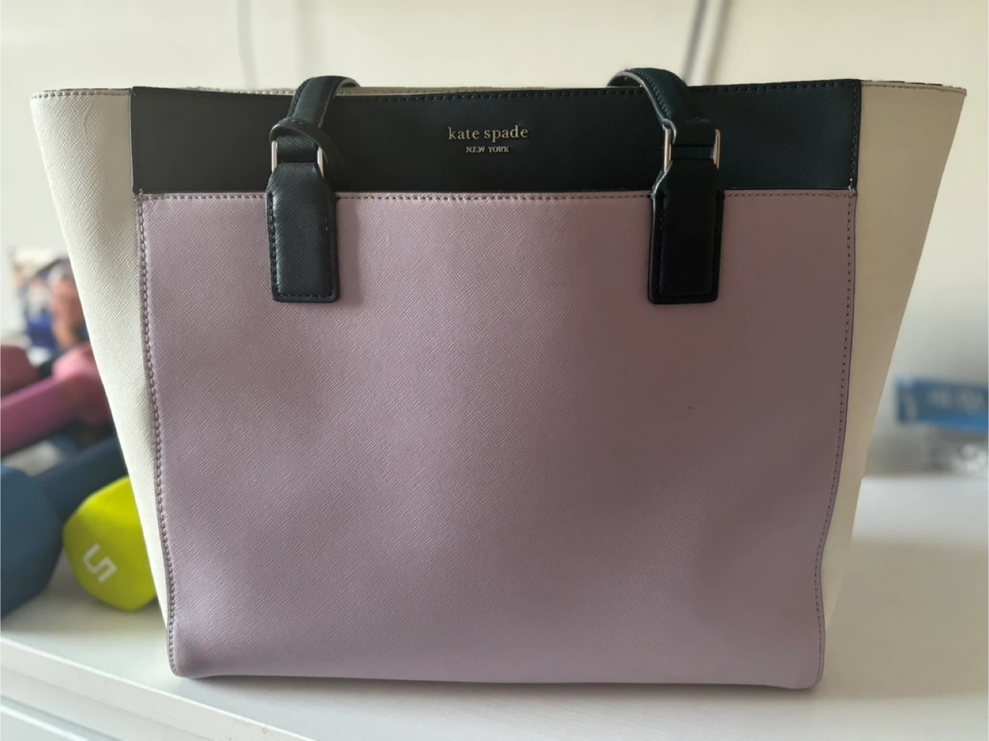 Selling a Kate Spade tote bag in a lovely lavender, cream, and black colour combination. It's in great shape and ready for a new home! Perfect for everyday use or as a stylish work bag.