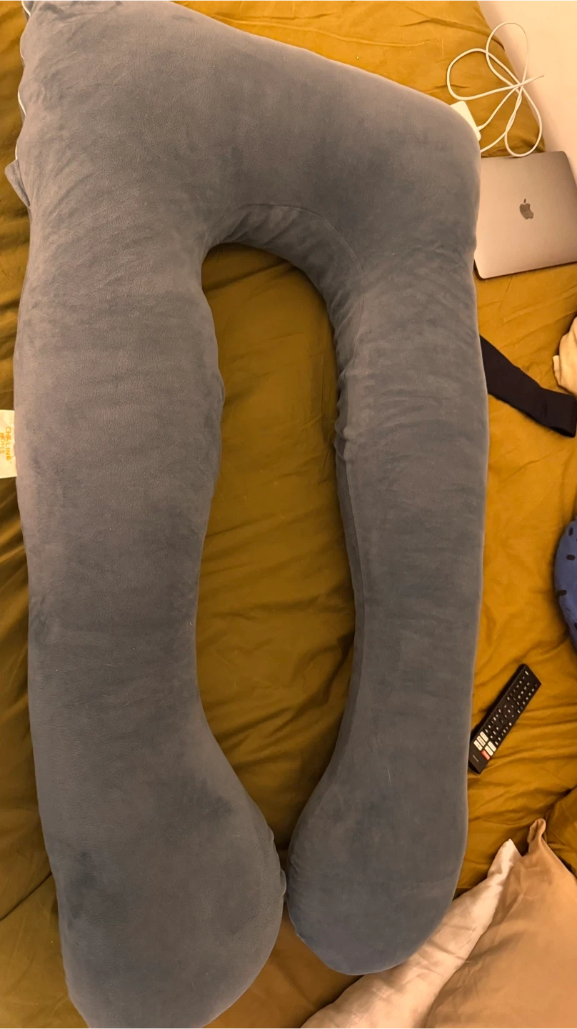This U-shaped full-body pillow offers support for sleeping and lounging. It's covered in a soft grey fabric. Excellent for expectant mothers and anyone seeking extra comfort.
