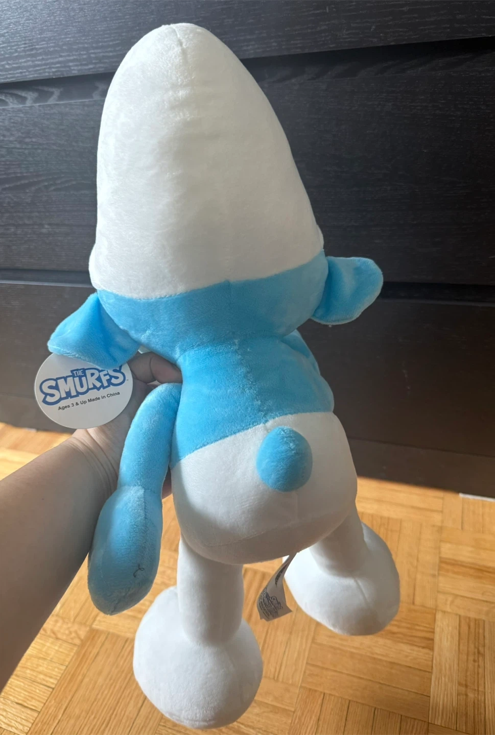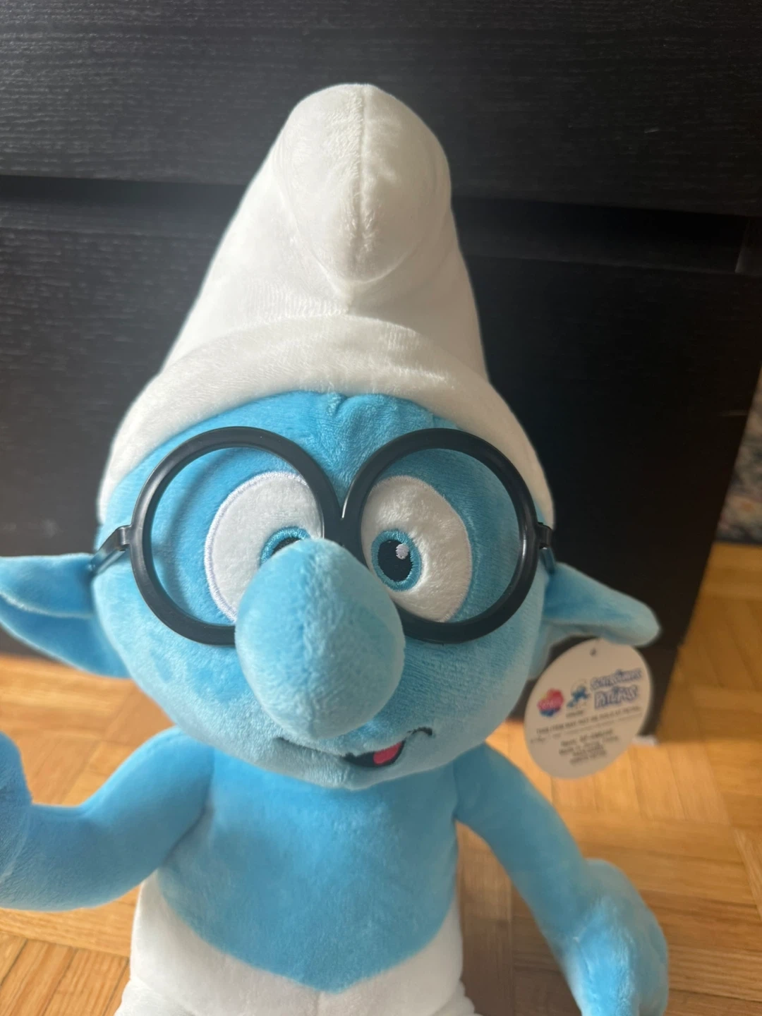 A soft blue plush toy of a Smurf wearing glasses and a white hat. This item is suitable for ages 3 and up.