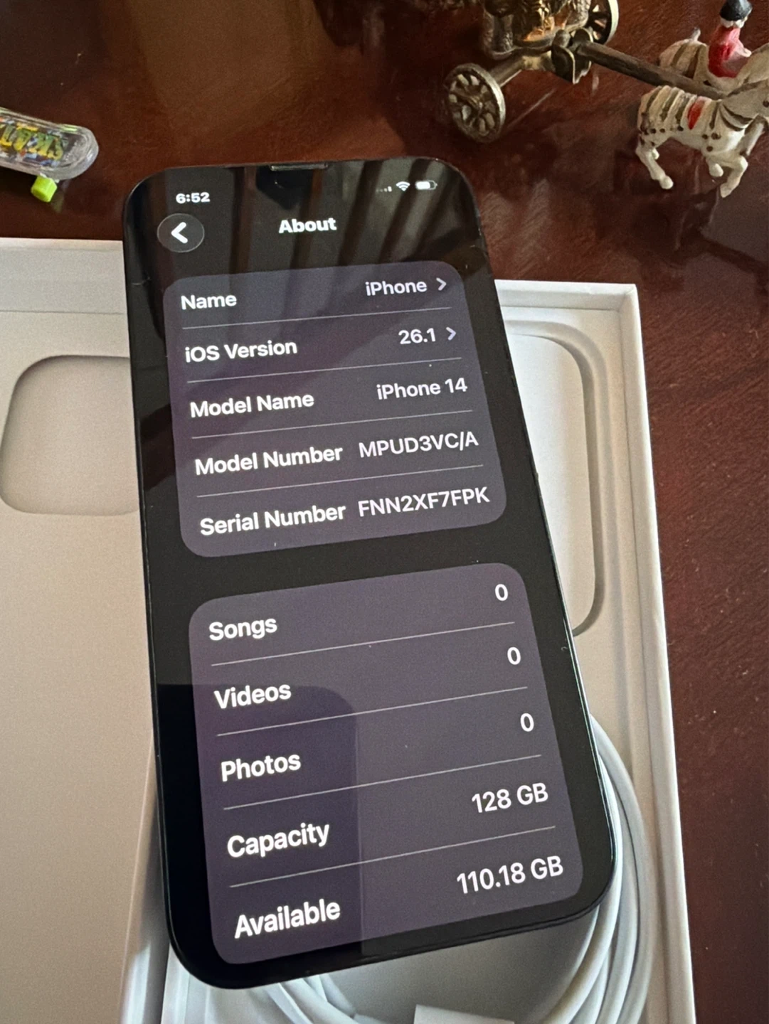 128Gb model. Optimized battery charging is enabled to reduce aging. Good cosmetic shape. No problems with phone, just got a new one.