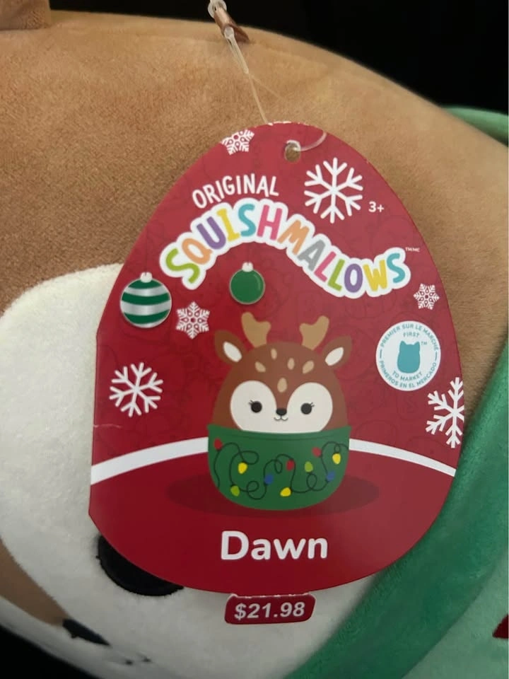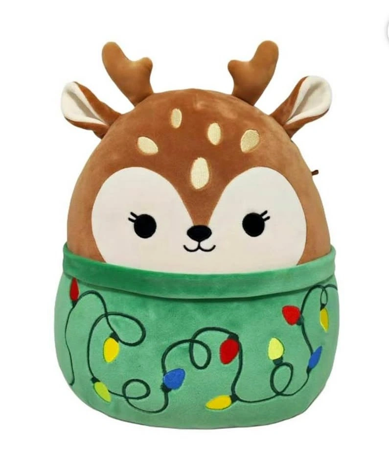 Festive Squishmallows “Dawn.” This reindeer plush has a cute green outfit with colorful Christmas lights. Super soft and cuddly. Brand new with original tag.