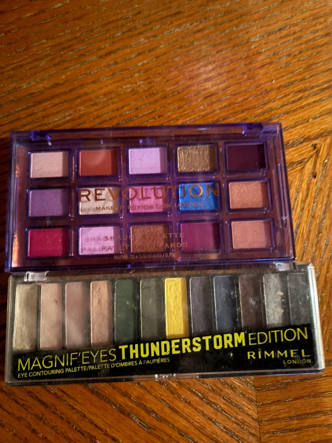 Two eyeshadow palettes: a Revolution palette with 15 shades and a Rimmel Magnif'Eyes Thunderstorm Edition palette with 12 shades. Both are eye contouring palettes.