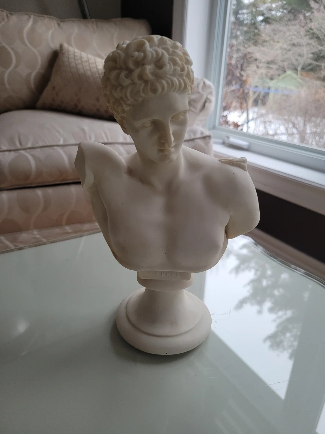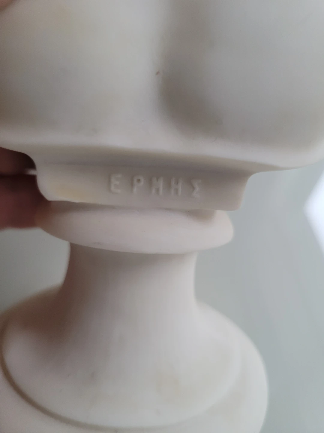 This is a marble like bust of Hermes. It's a decorative piece for your home. The base has the name 'ΕΡΜΗΣ' inscribed, which is Greek for Hermes.