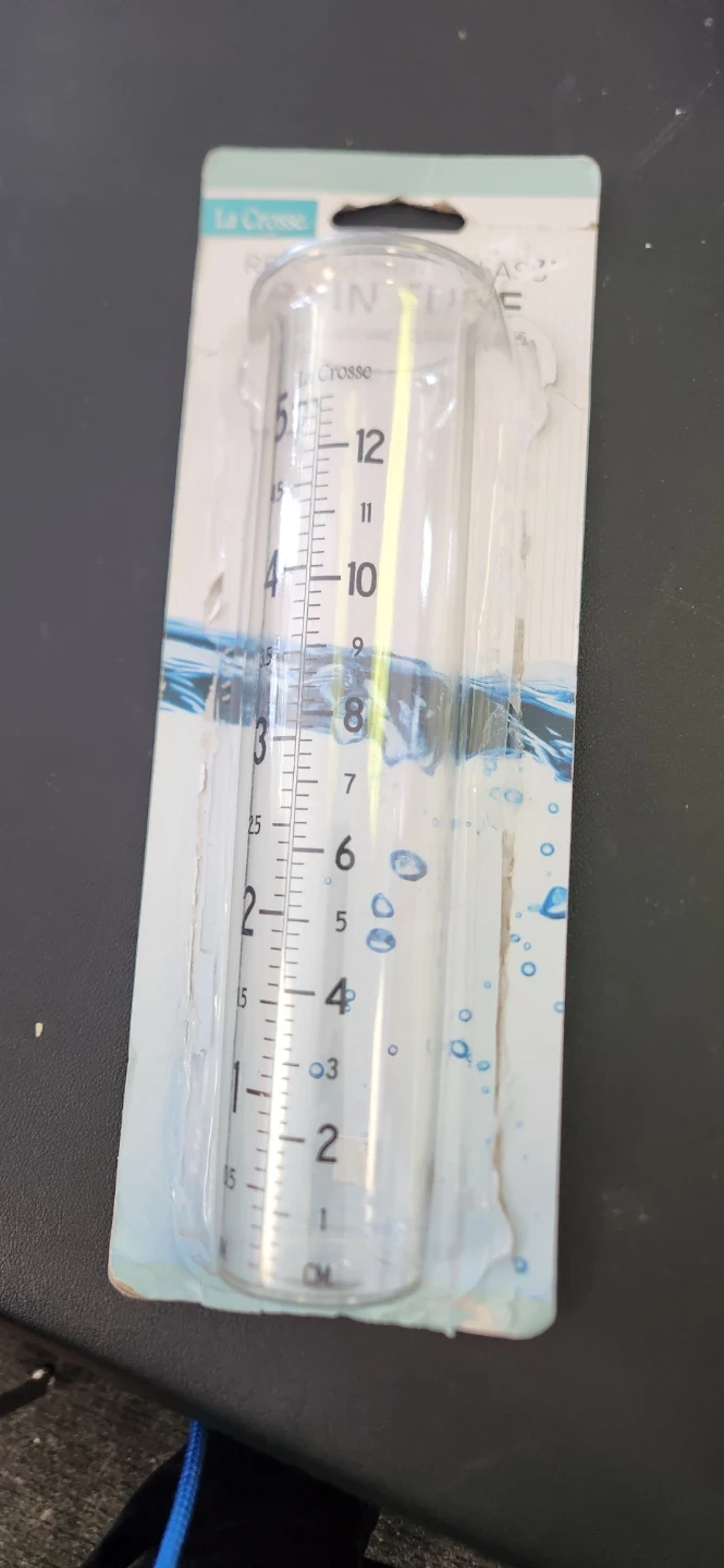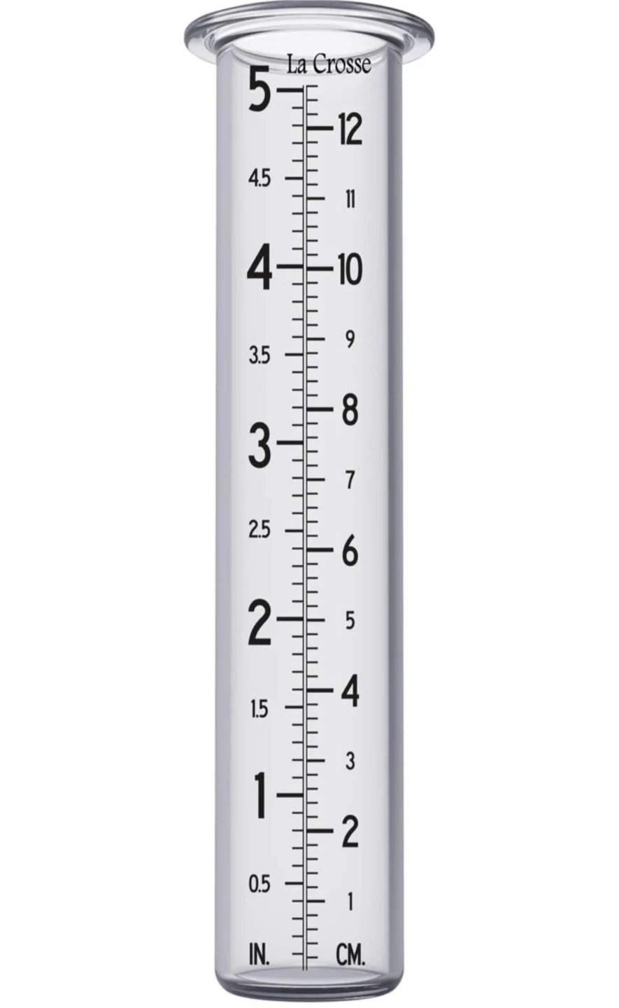 This is a La Crosse rain gauge. It measures up to 5 inches of rain. It's made of clear plastic with measurement markings in both inches and centimetres. Track your rainfall easily with this durable gauge!
