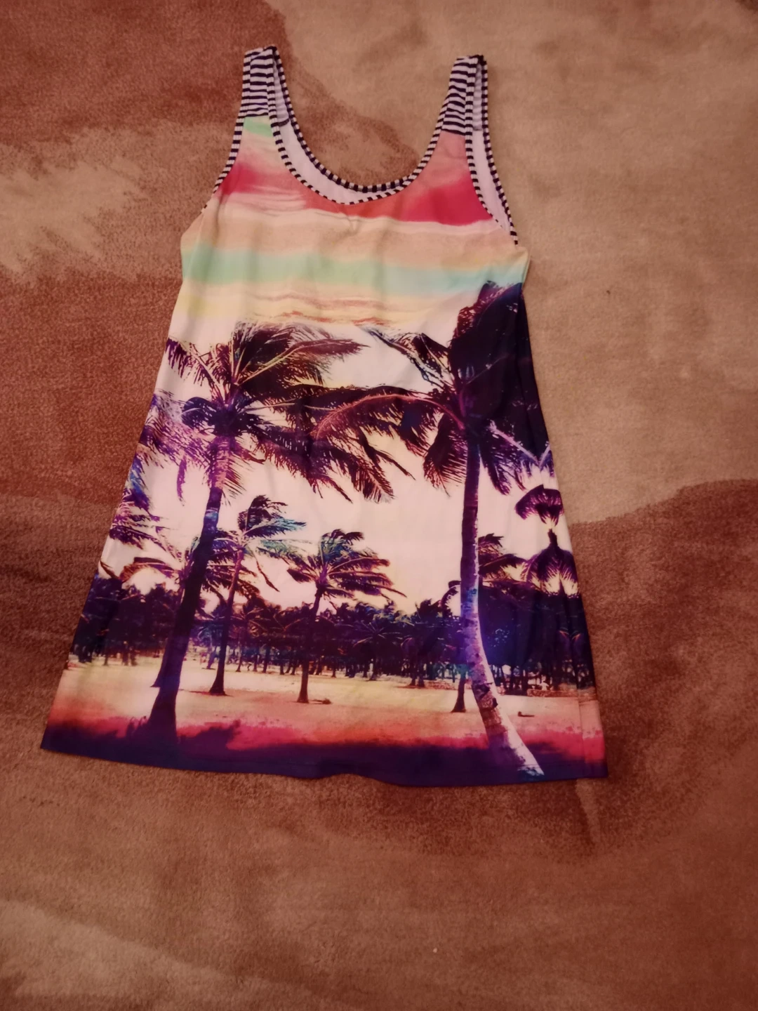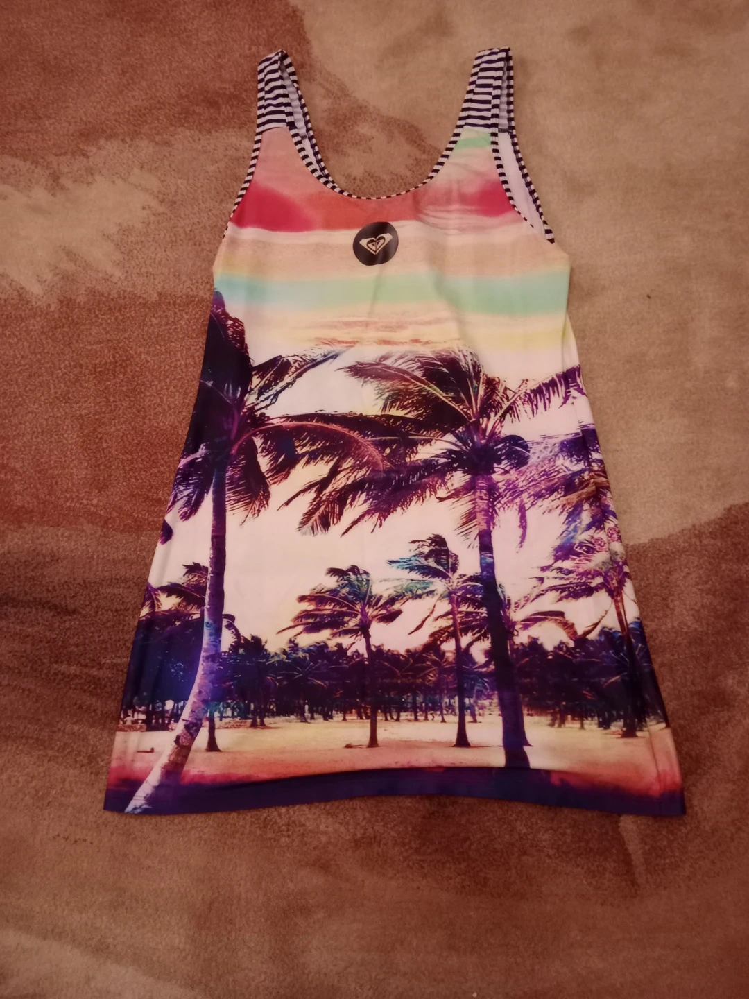 This is a used Roxy brand tank dress featuring a vibrant palm tree print, perfect for summer days. It's in good condition, ready for a new adventure.