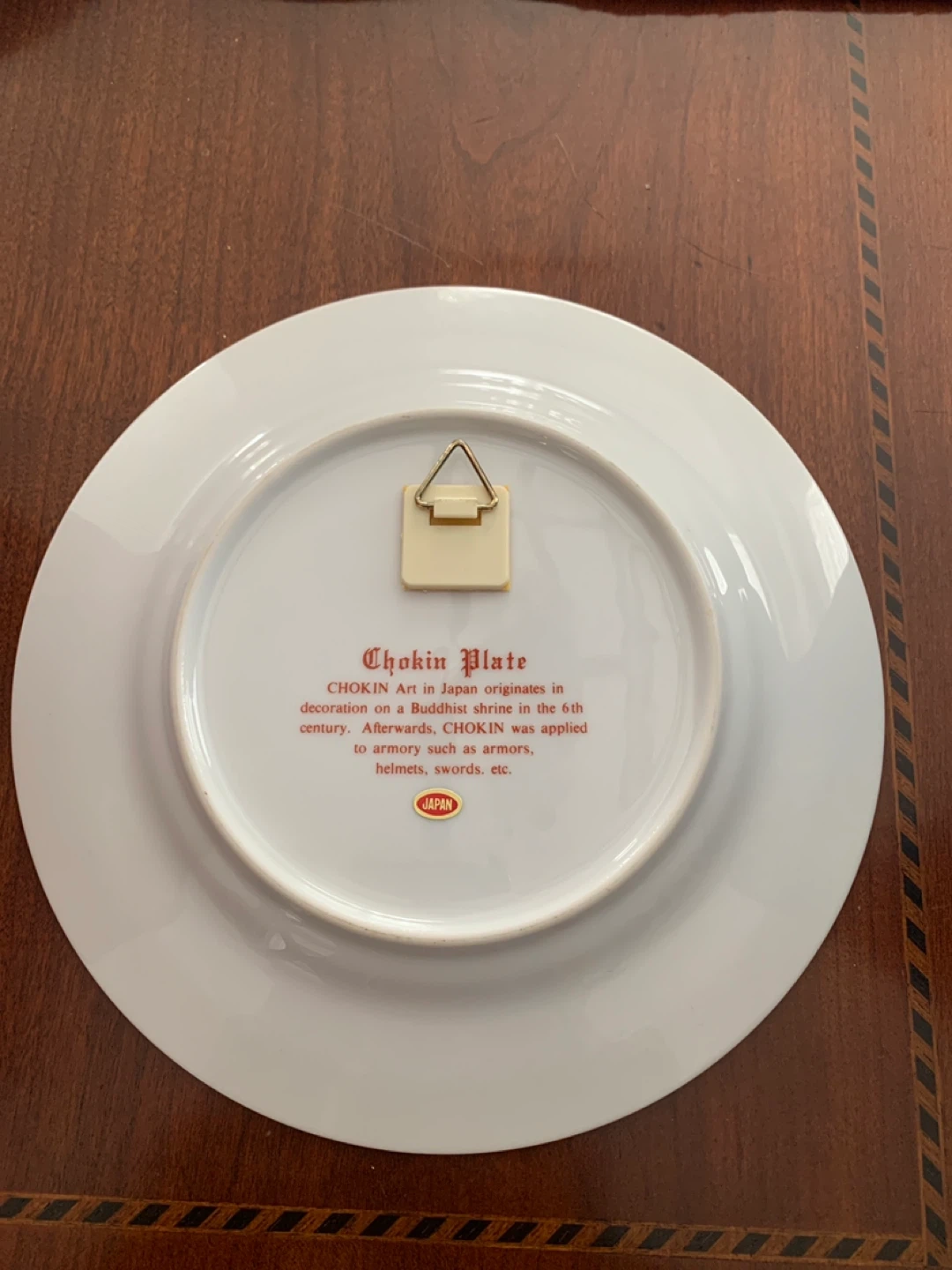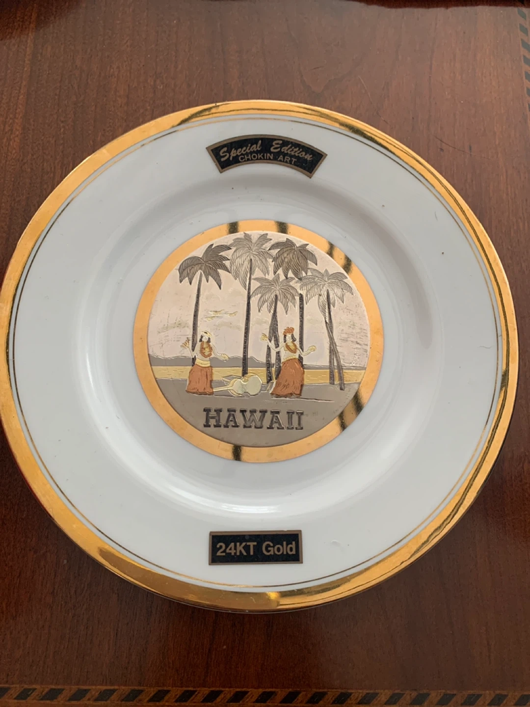 This is a Chokin Art plate from Japan featuring a Hawaii scene. It's a special edition with 24KT gold detailing around the rim and on the artwork. The plate has a hanger attached for display.