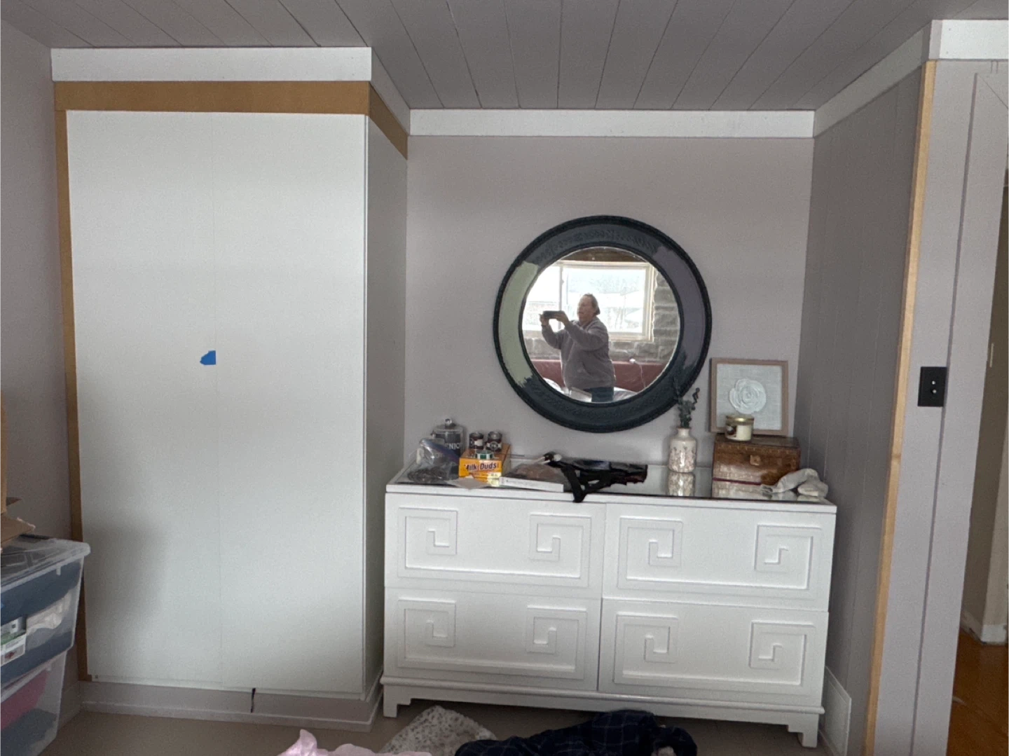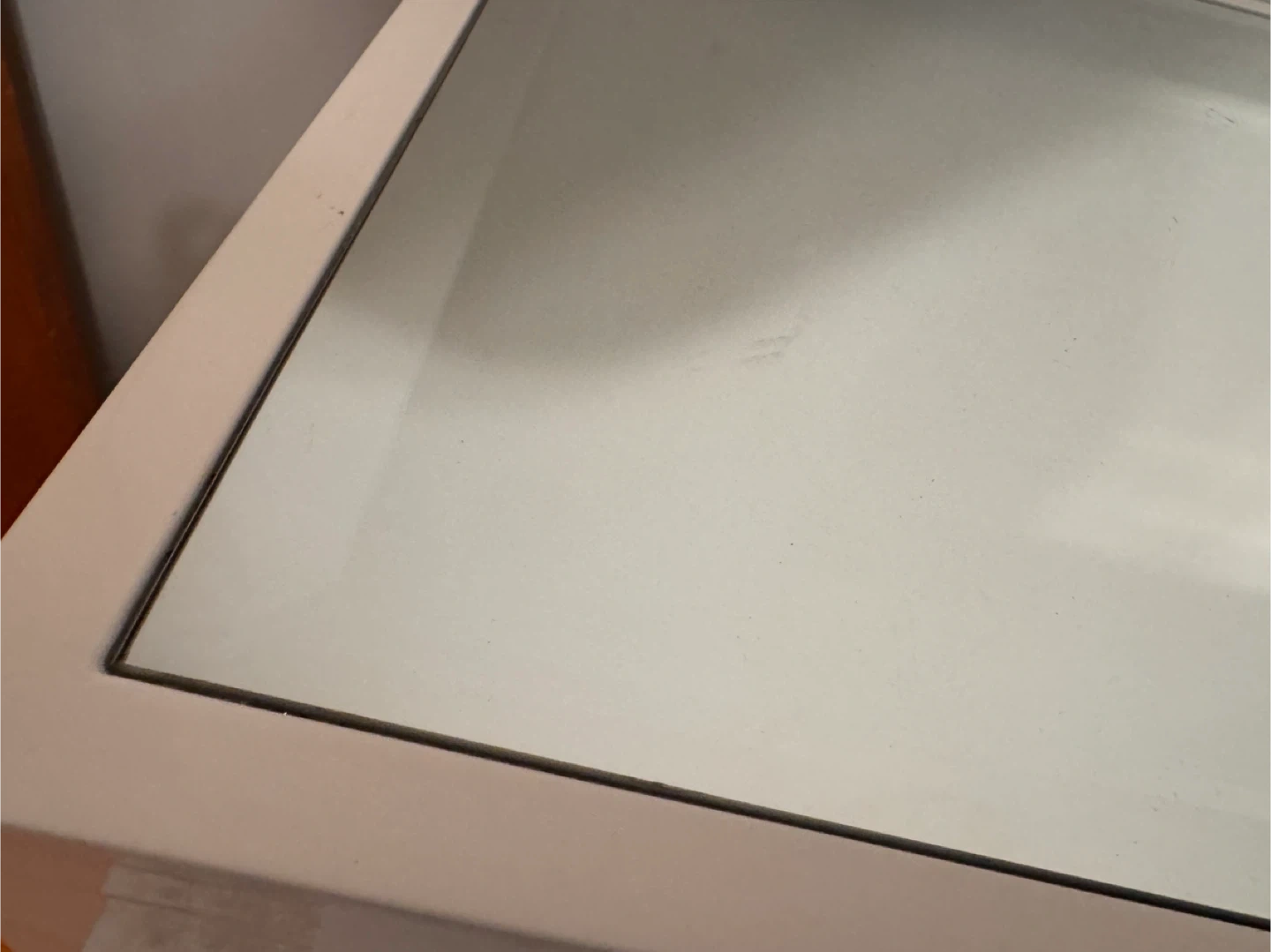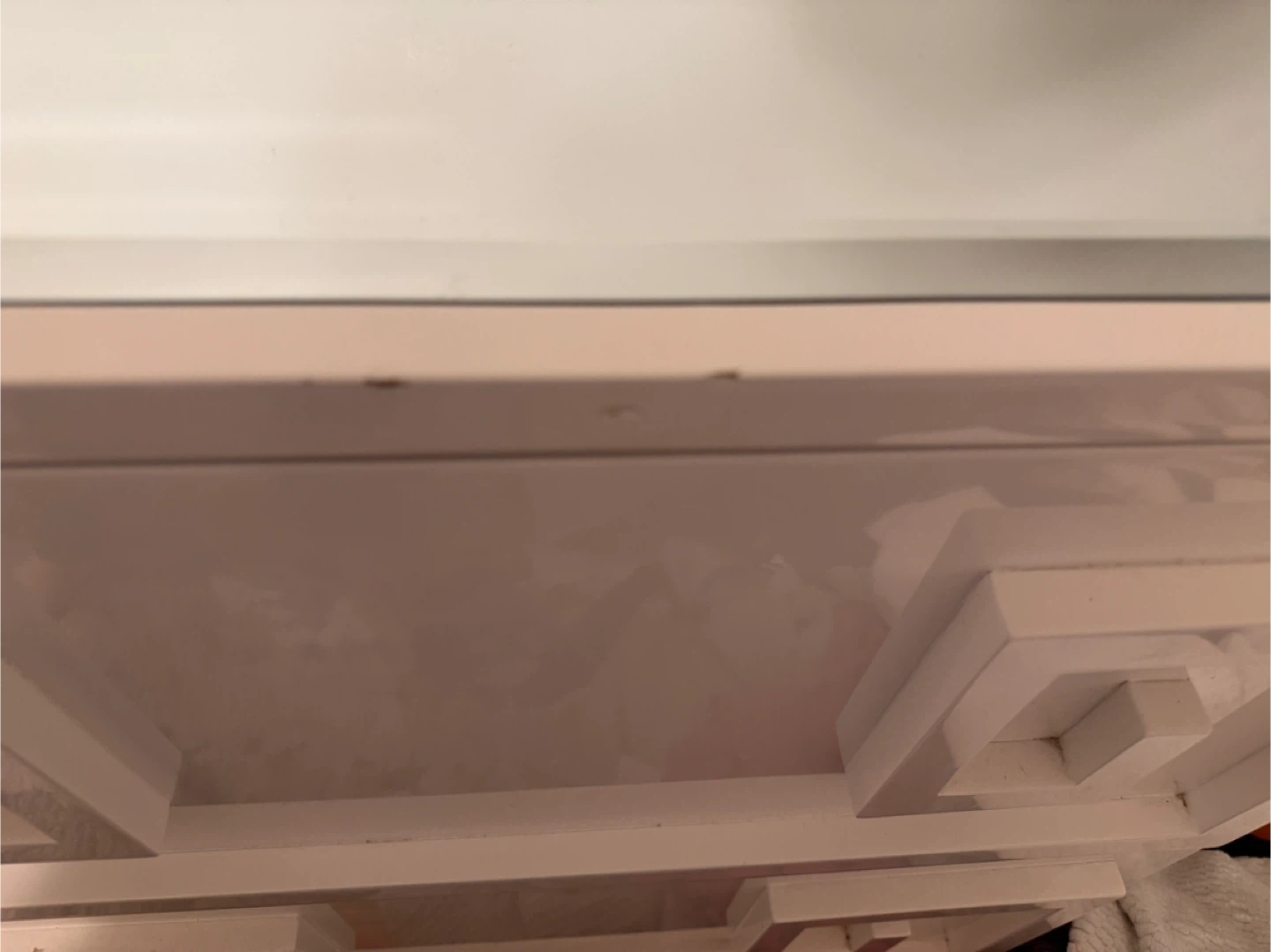 This white nightstand features a classic Greek key design on its two drawers. It has a mirrored glass top for a touch of elegance. It's a neat piece for beside the bed! The dresser has 4 deep drawers and can be used as a buffet in the dining room or split up doesn’t have to be used as a set I didn’t