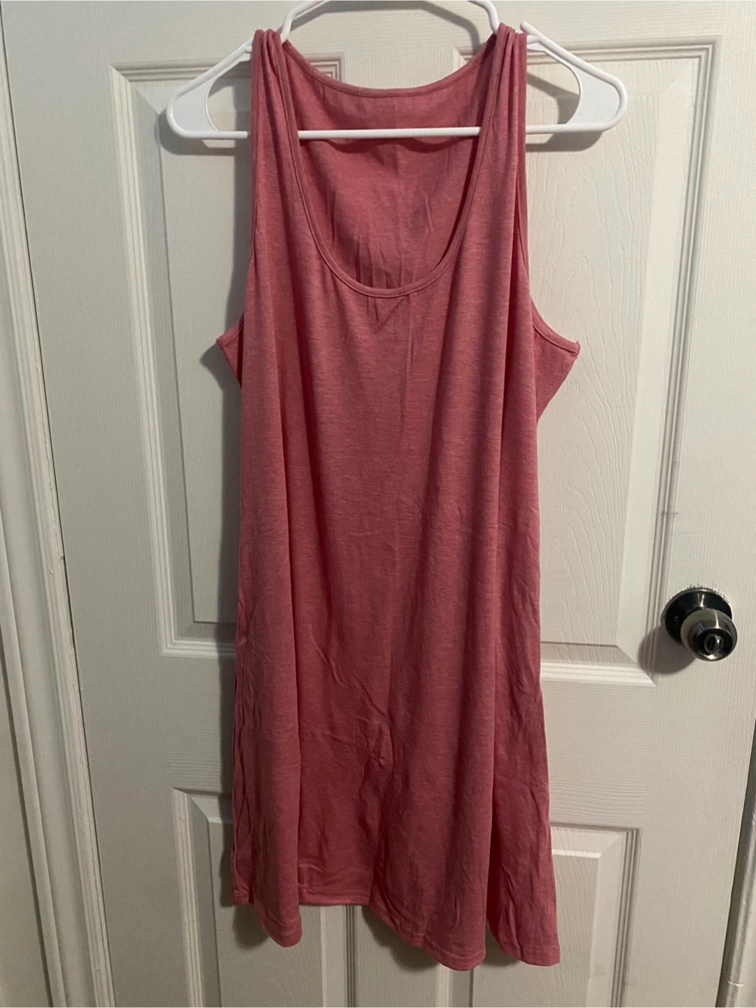 This is a pink tank top dress. It's made of a soft, lightweight material. Great for layering or wearing on its own during warmer weather! Has pockets!