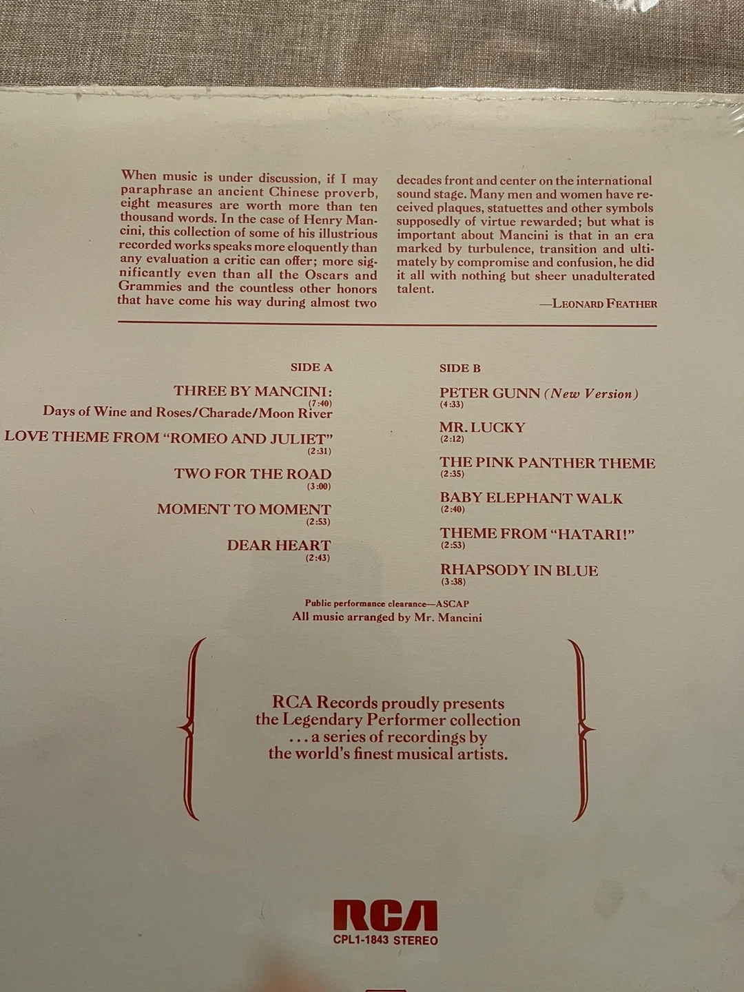 Selling a Henry Mancini - A Legendary Performer 1976 vinyl record. It includes an illustrated booklet with a 4-color picture suitable for framing. Still sealed. Cash only