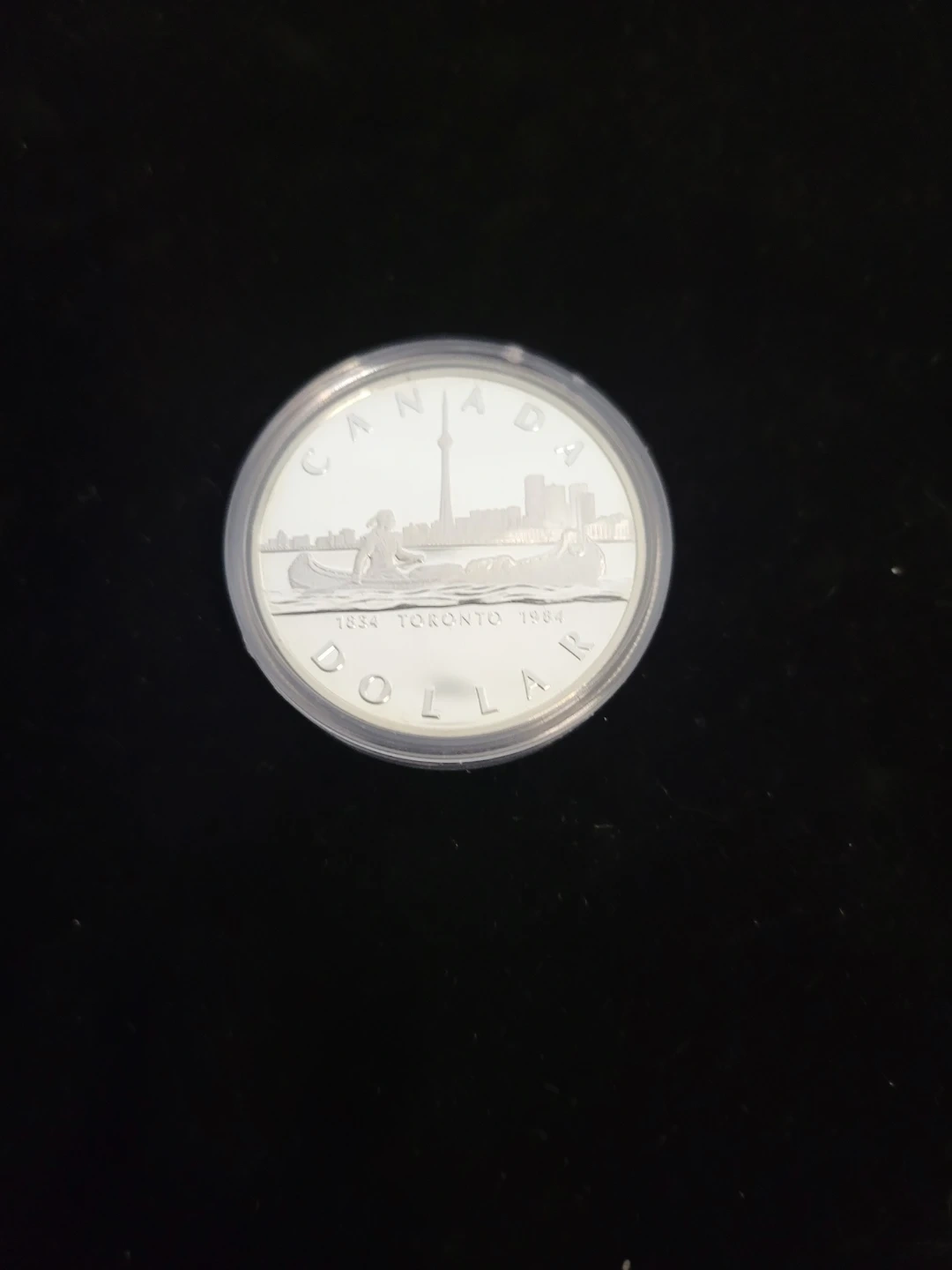 Selling a 1984 Canadian Silver dollar coin featuring a Toronto skyline design. It's in great condition and comes in a protective case!