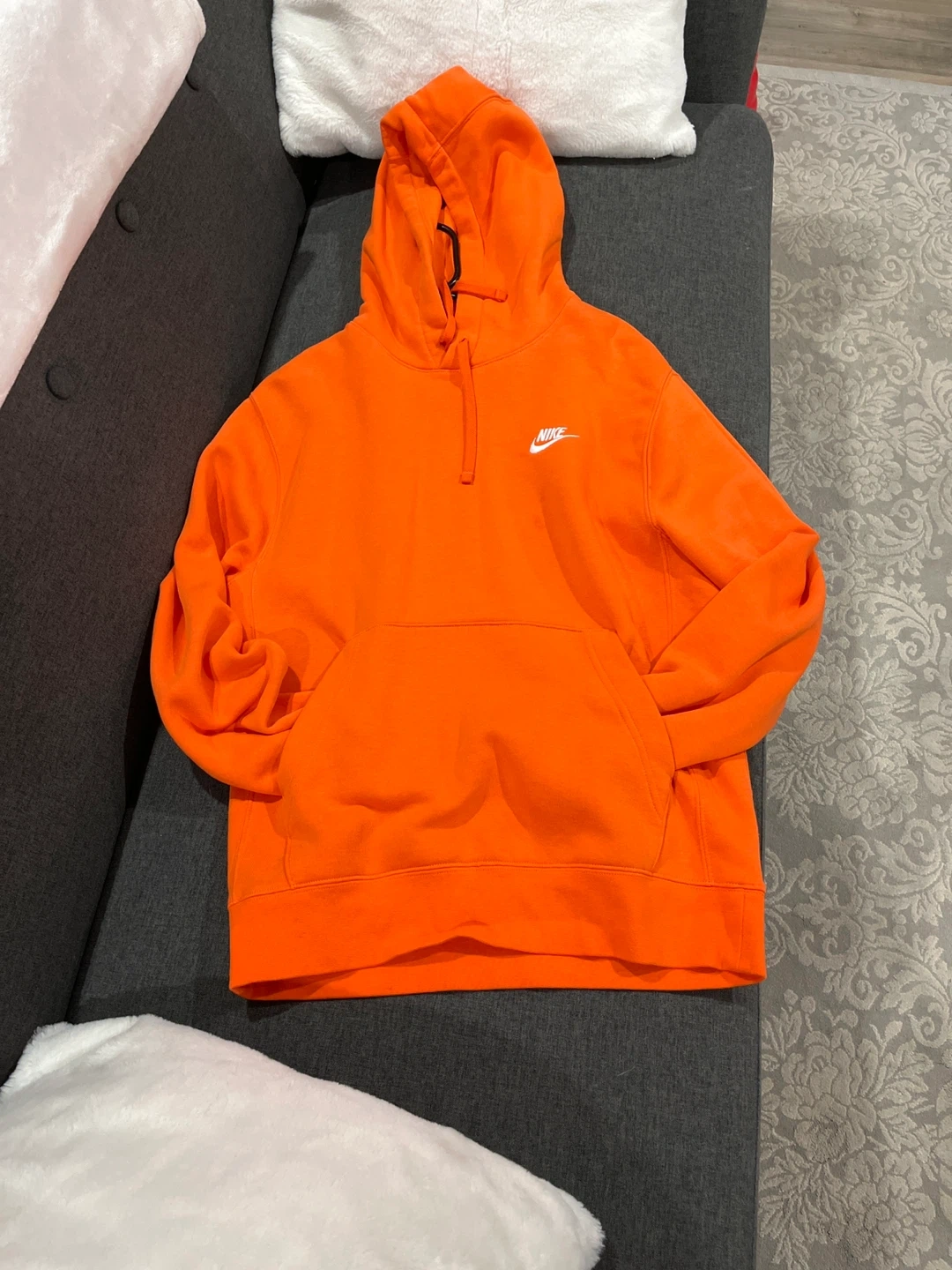 This is a vibrant orange Nike hoodie. It features the classic Nike logo on the chest and a front pouch pocket. The material is soft and comfortable.