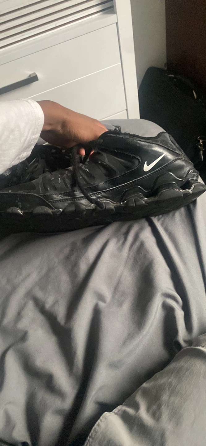 Black Nike running shoes in a men's US size 13. These shoes feature a durable outsole for traction. They're designed for athletic performance.