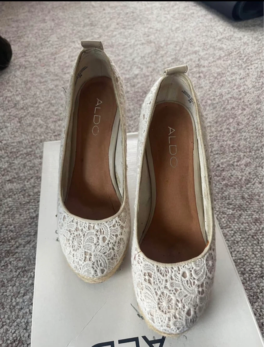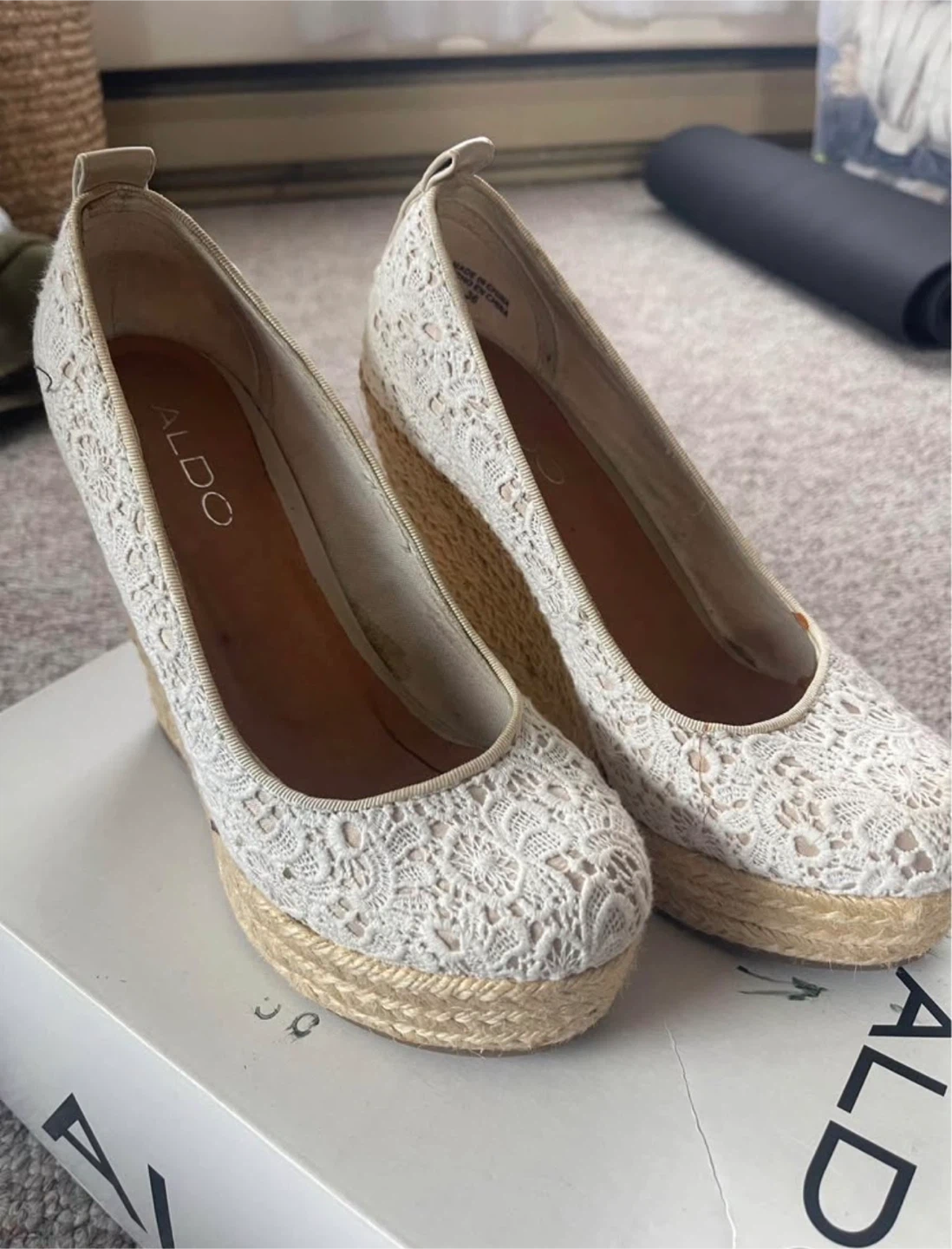 ALDO wedge heels with a delicate white lace overlay. They feature a comfortable espadrille wedge and a light beige trim. Perfect for spring and summer occasions!