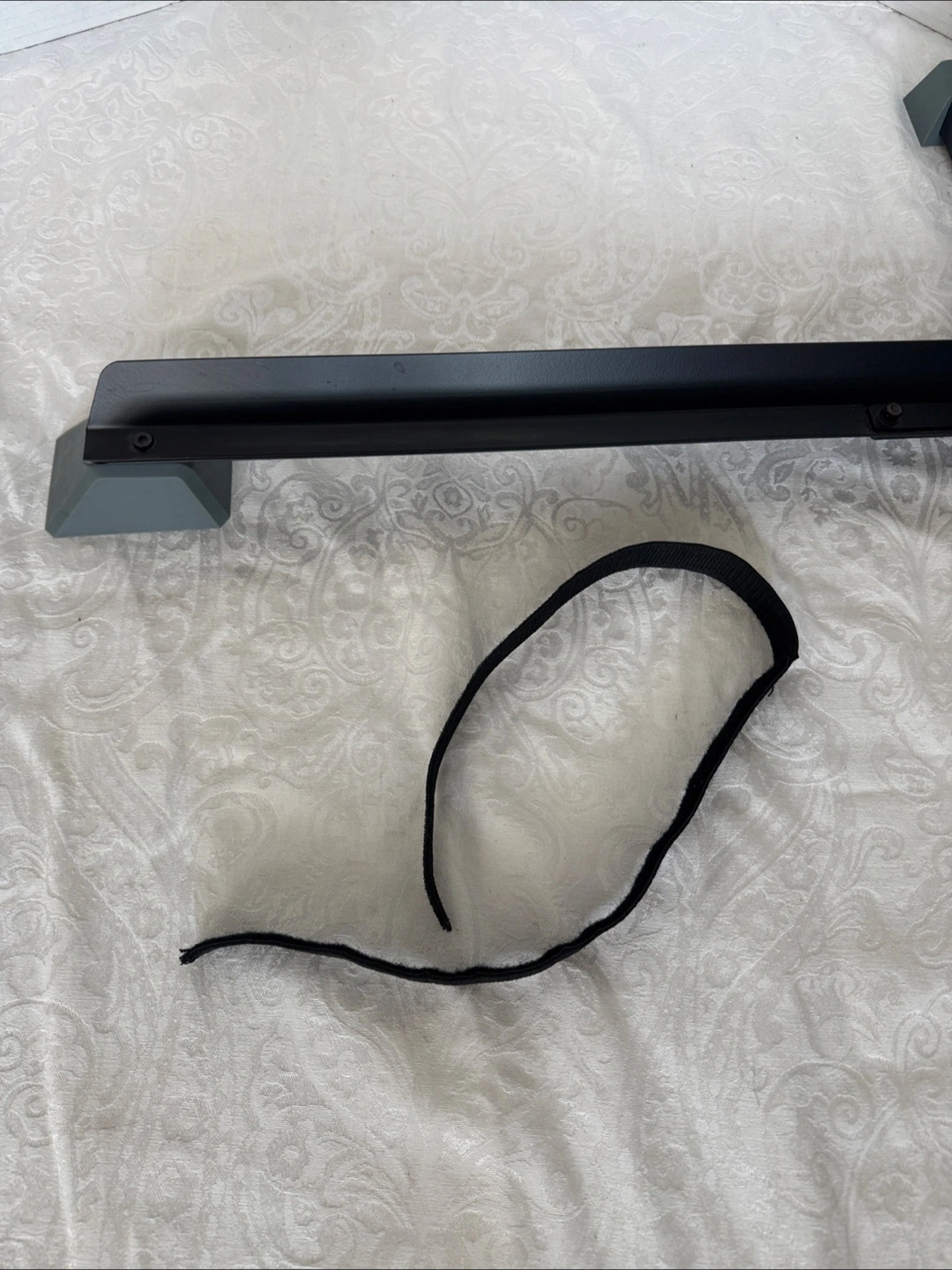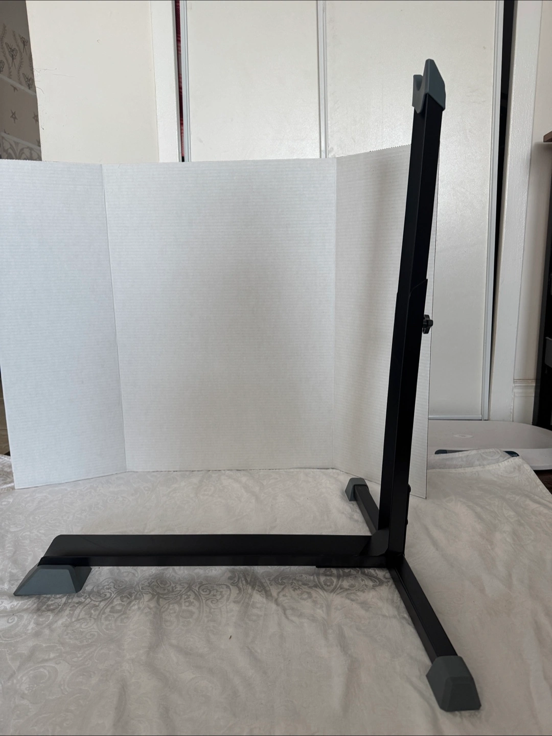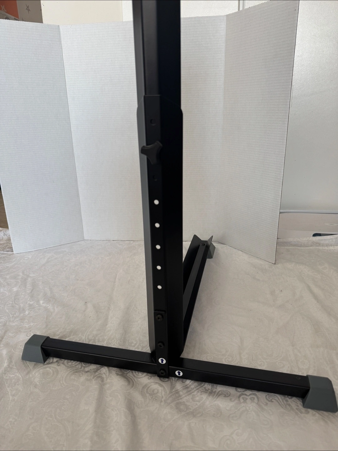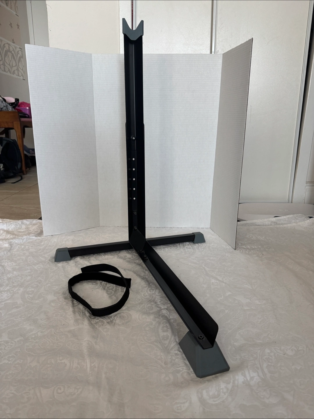 Bicycle stand. Great solution for small spaces to store your bike. See example. Adjustable height. Includes strap for securing bike. Durable metal construction. Grey and black.