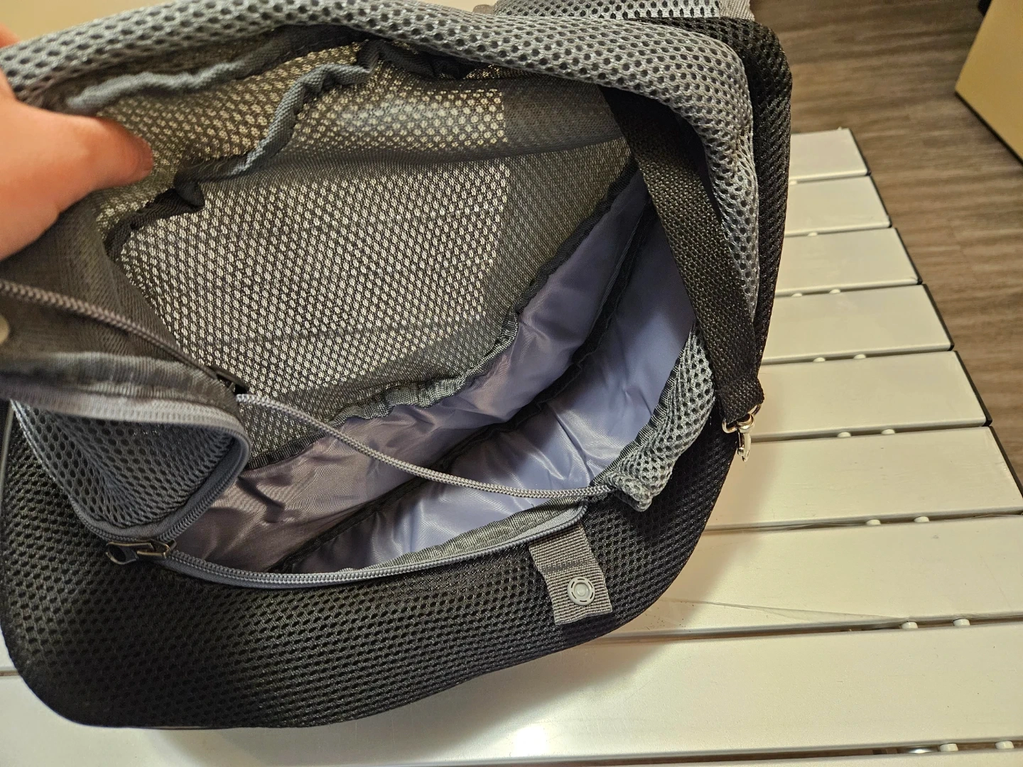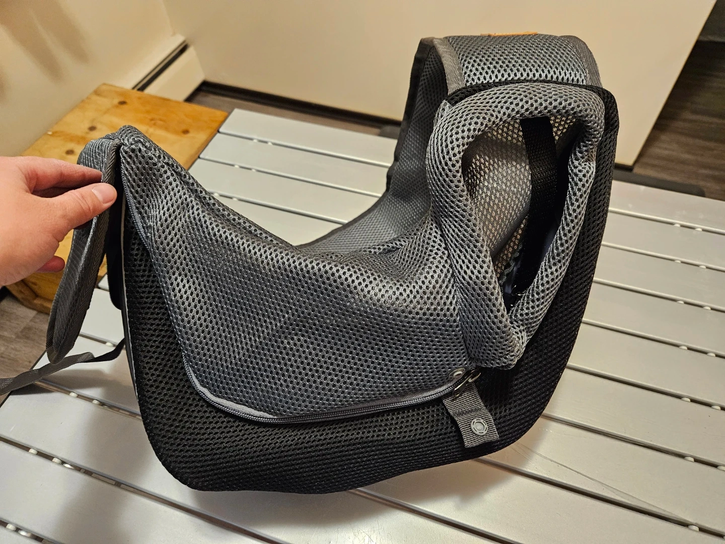 This Cuby pet sling carrier is made with breathable mesh fabric. It features a zippered main compartment and a small pocket for essentials. It's designed for small pets to travel comfortably.