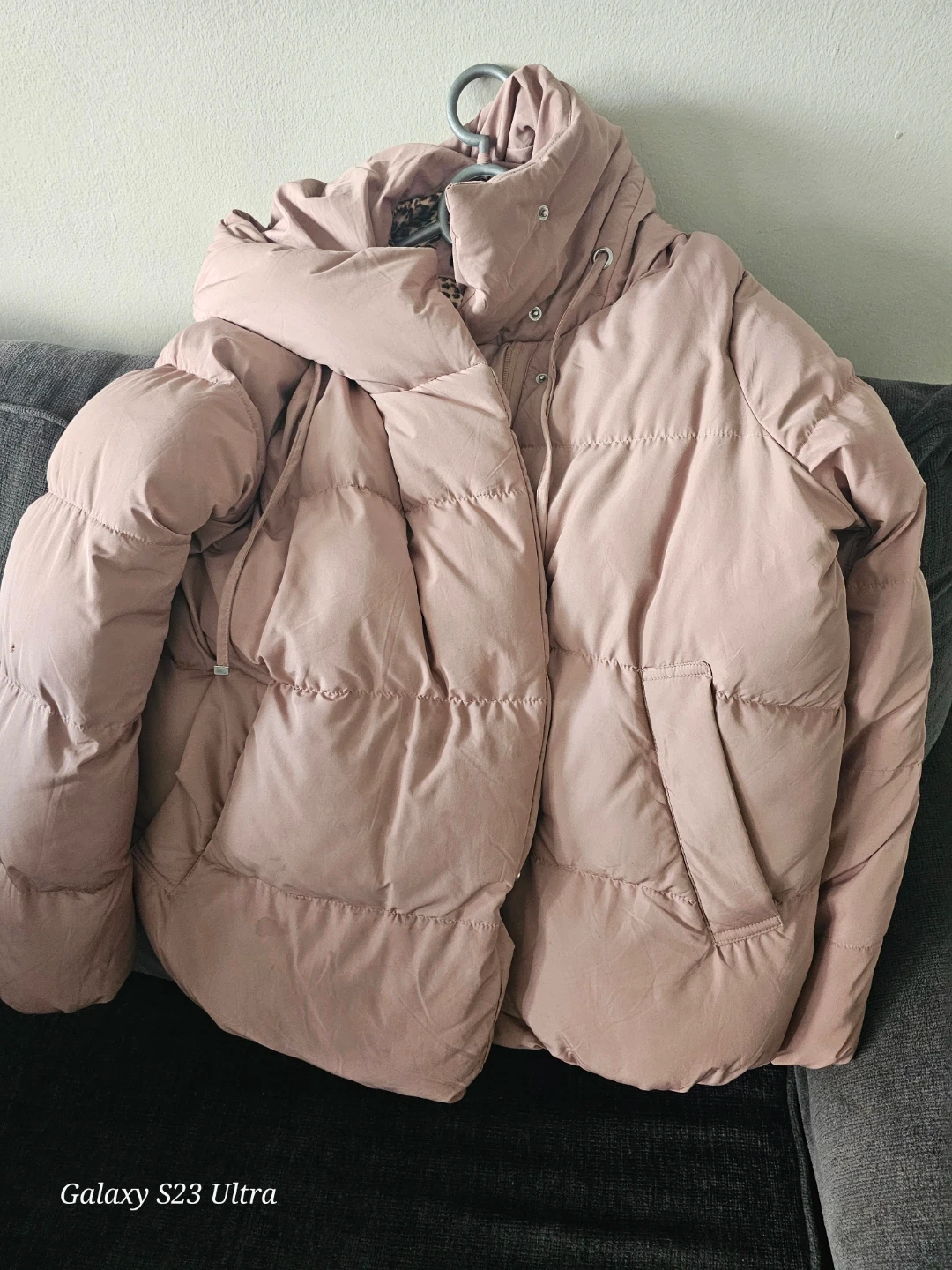 This is a pink puffer jacket. It has a cozy, insulated design with a high collar and hood. Pockets are on the front.size large