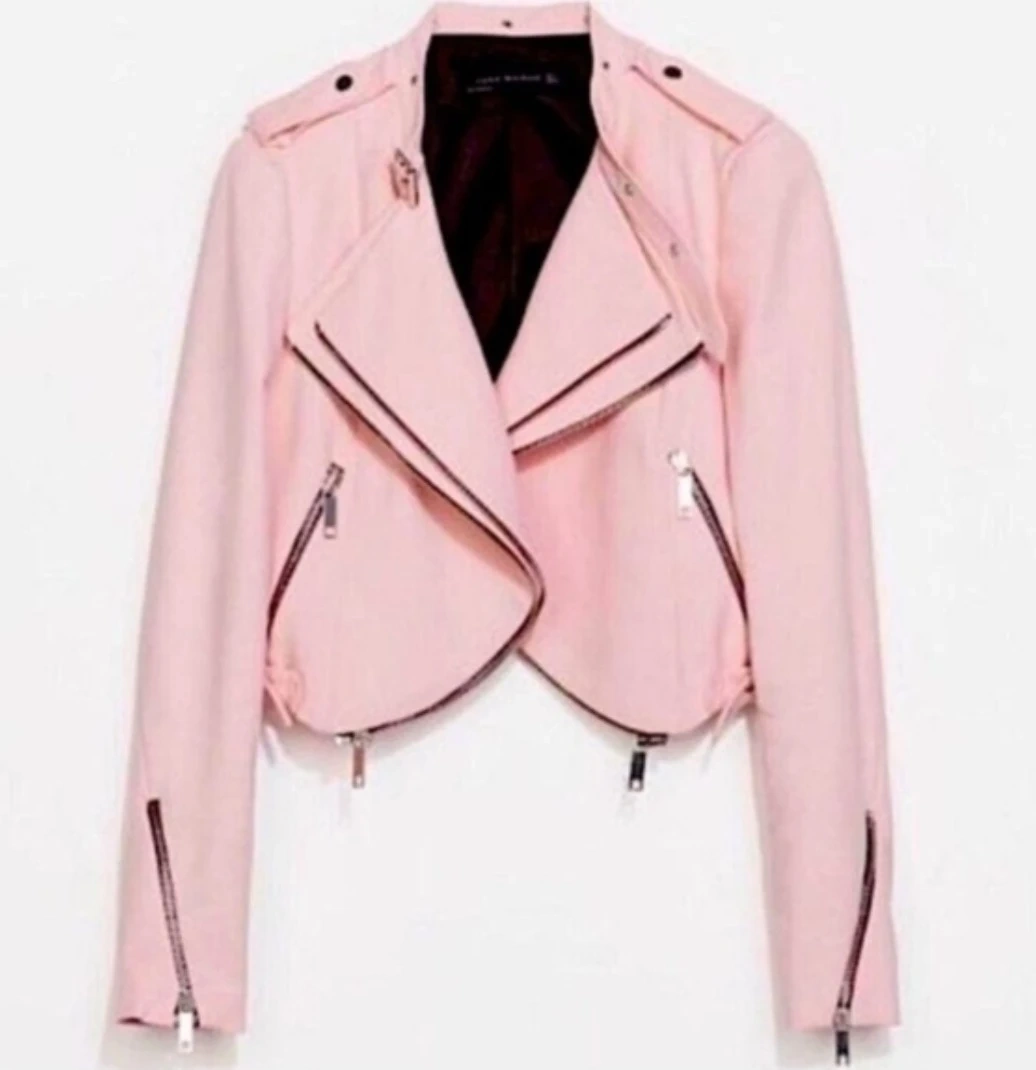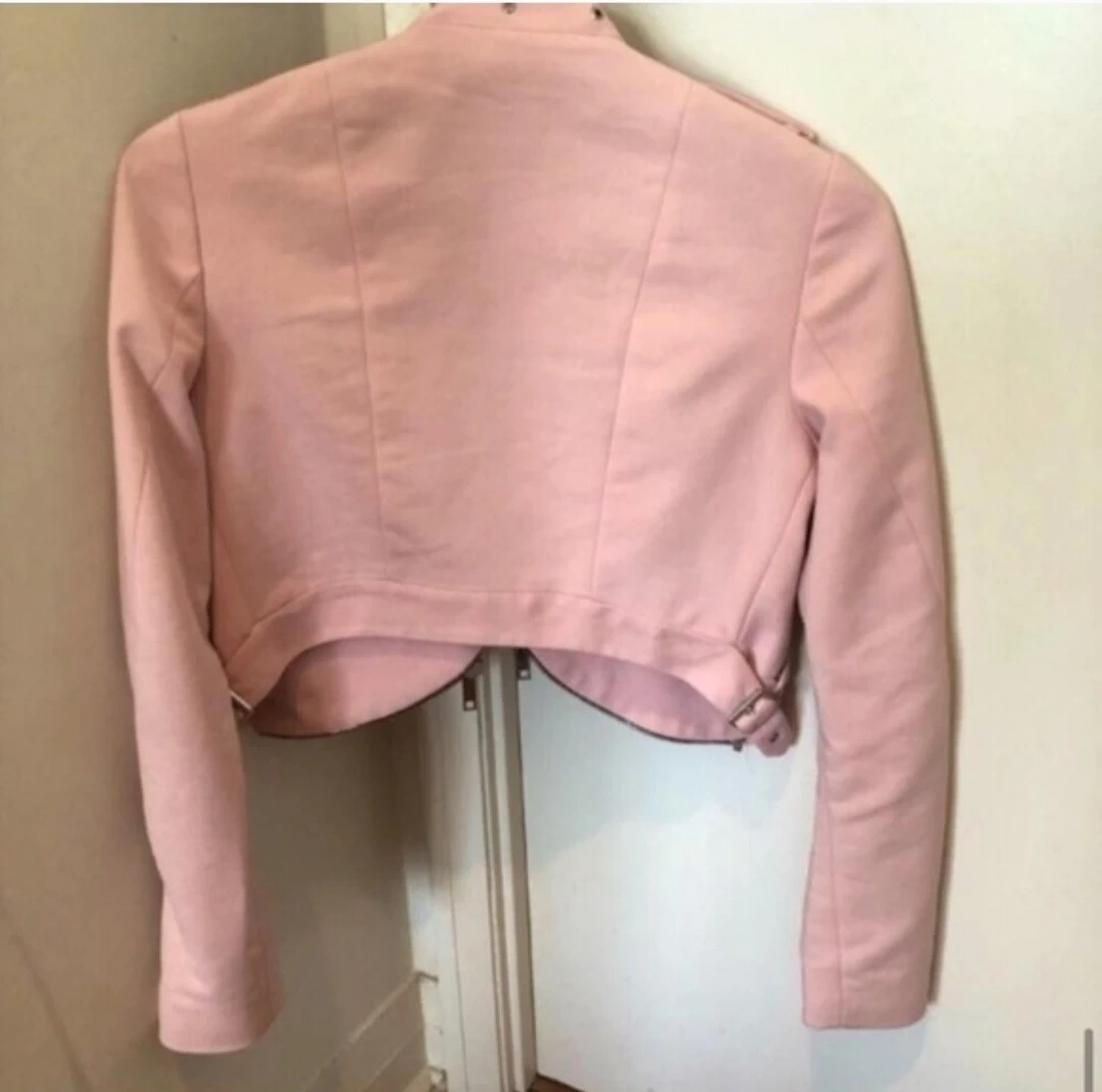 Zara Woman cropped moto jacket in a soft pink colour. This jacket features a zip-up front, lapels, and zippered cuffs. It's made in Morocco. Size XS.