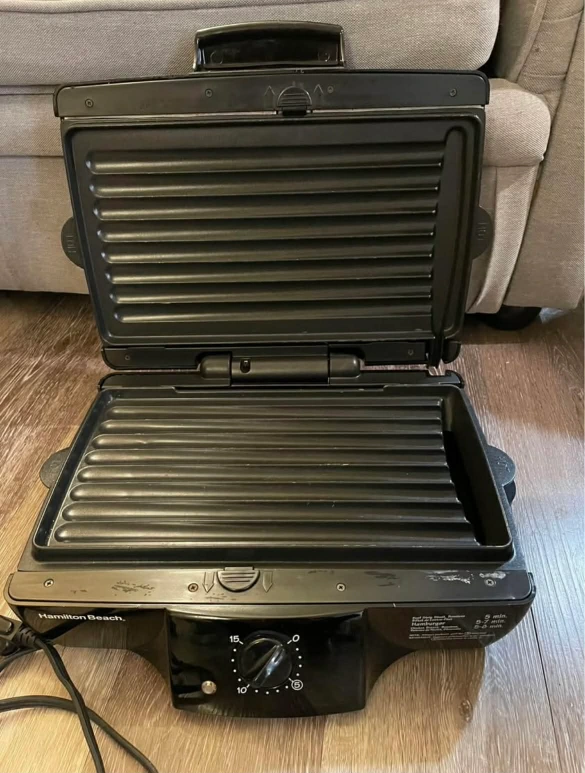 Hamilton Beach electric grill for sale. It features a non-stick surface and a 15-minute timer. Great for cooking burgers, chicken and steaks quickly!