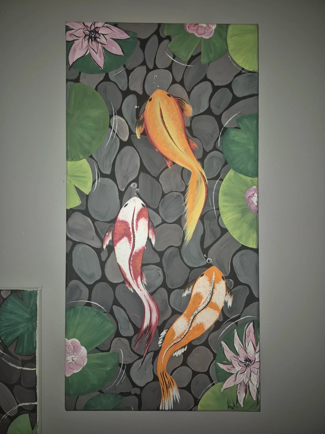 A beautiful hand-painted canvas depicting three koi fish swimming among lily pads and pebbles. The vibrant colours and serene scene add a touch of tranquility to any space. Signed by the artist.