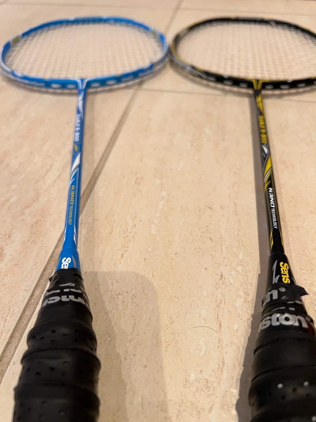 Two Senson badminton racquets, one blue and one black and yellow. Comes with a Senson branded carry bag. These racquets feature nano technology. Great for recreational play!