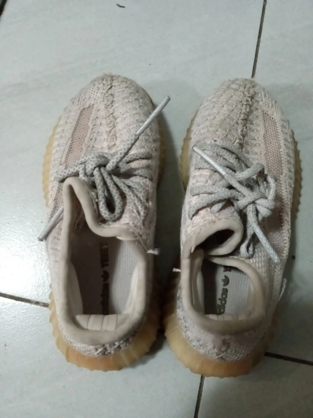 Selling a pair of Adidas Yeezy Boost 350 V2 sneakers for kids. They're in used condition but still have lots of life left! Great for casual wear.