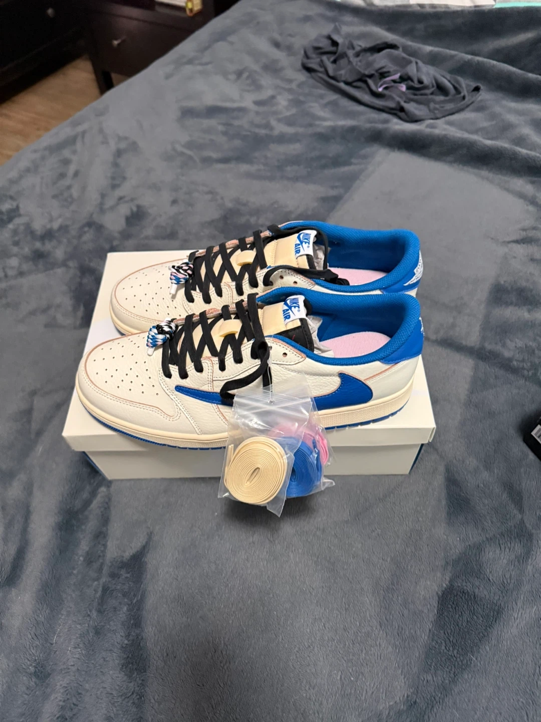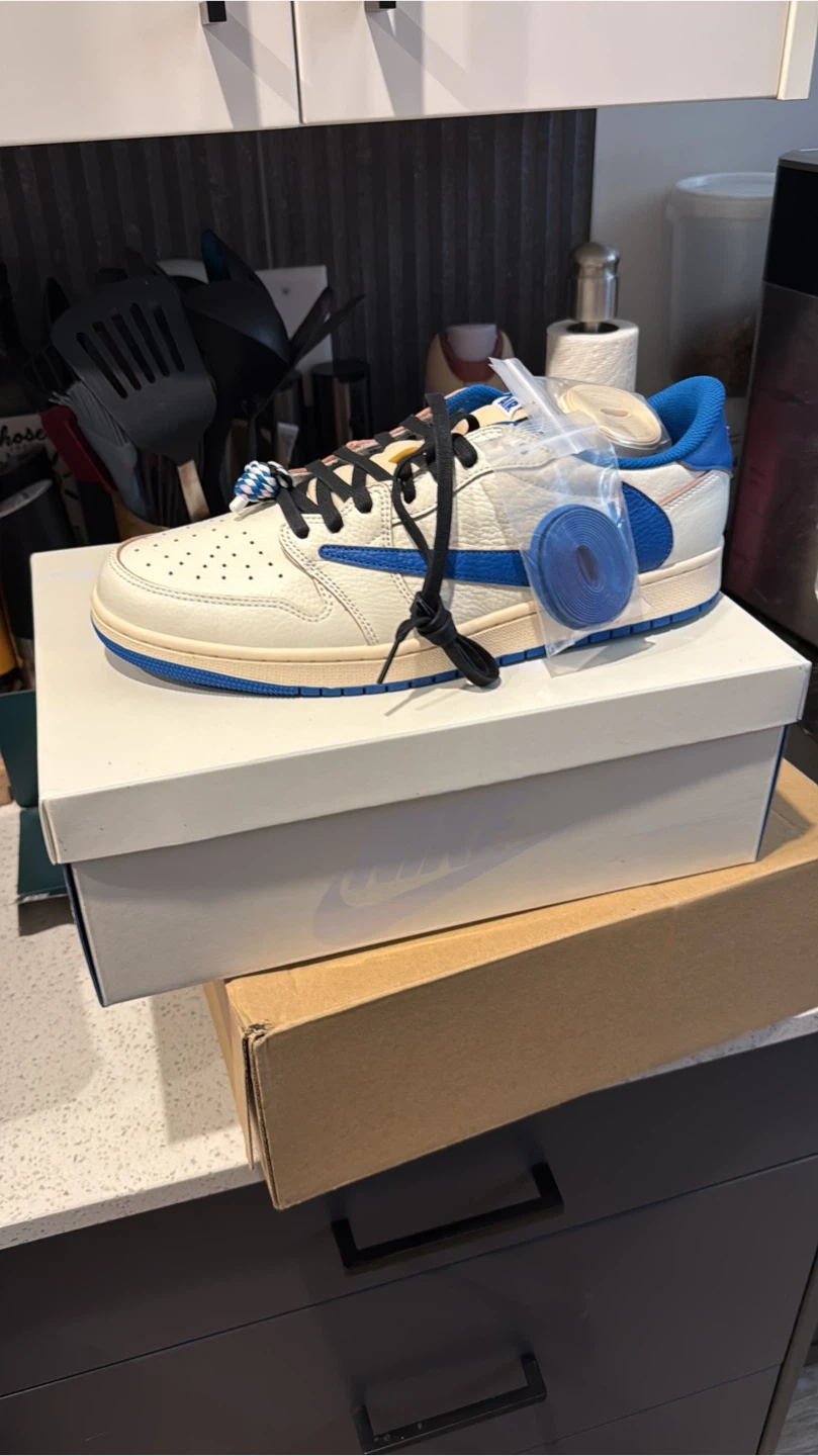 These iconic low-top sneakers feature a cream leather base with blue accents and Travis Scott detailing. Includes extra laces and the original box.