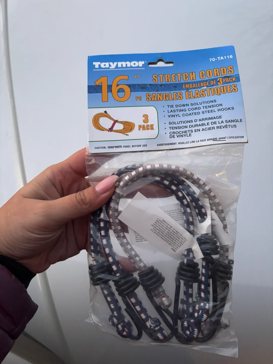 Selling a pack of Taymor 16" stretch cords. This is a 3 pack of tie-down solutions with lasting cord tension and vinyl-coated steel hooks. Perfect for securing items!