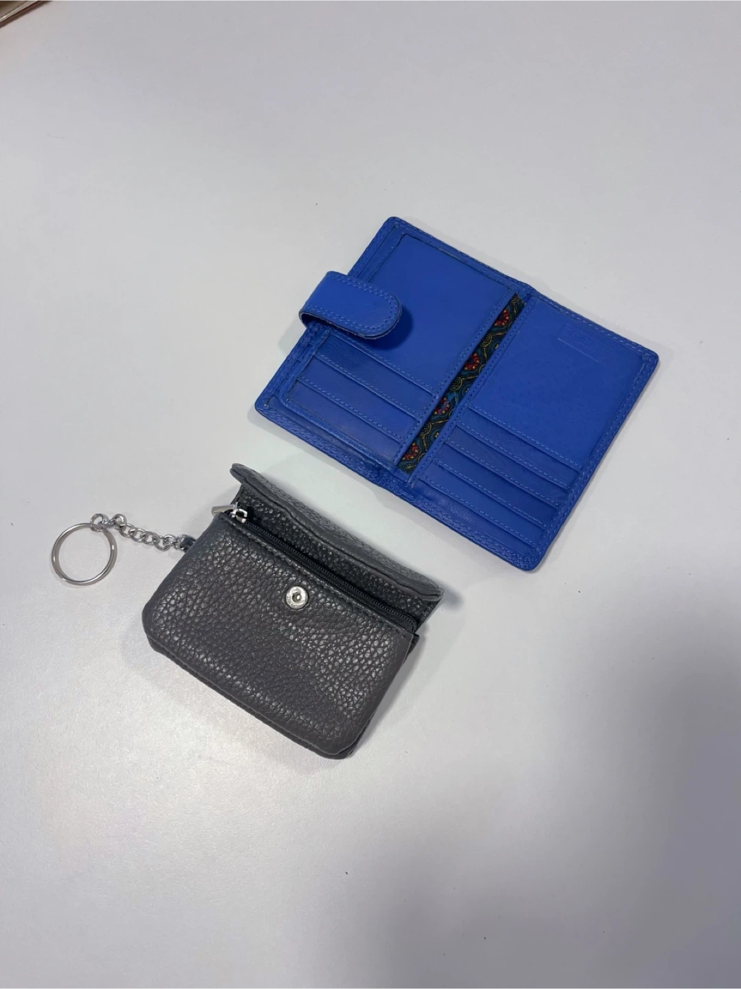 -one grey coin purse with a keychain.
