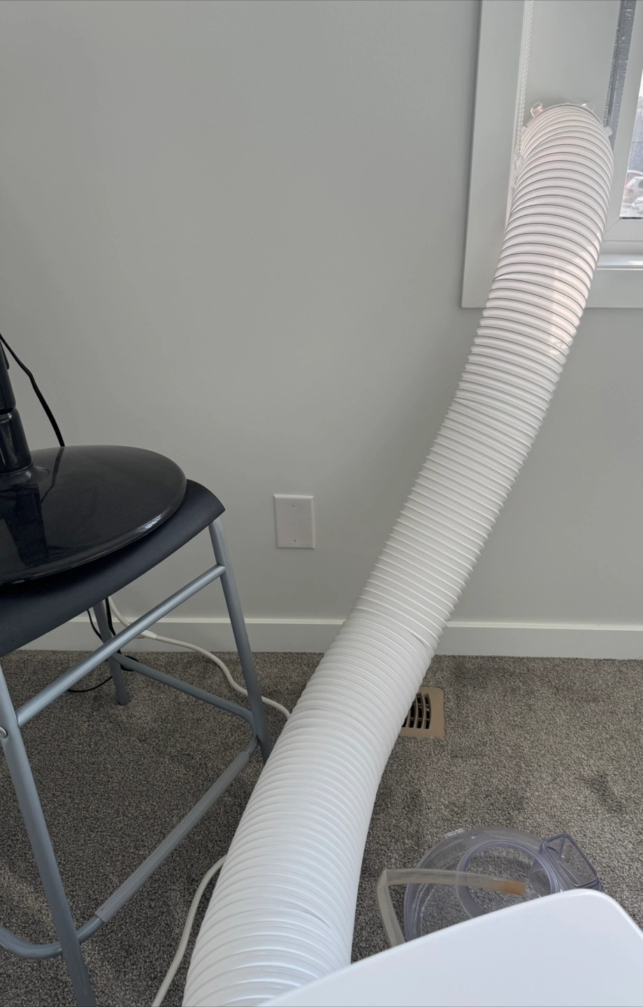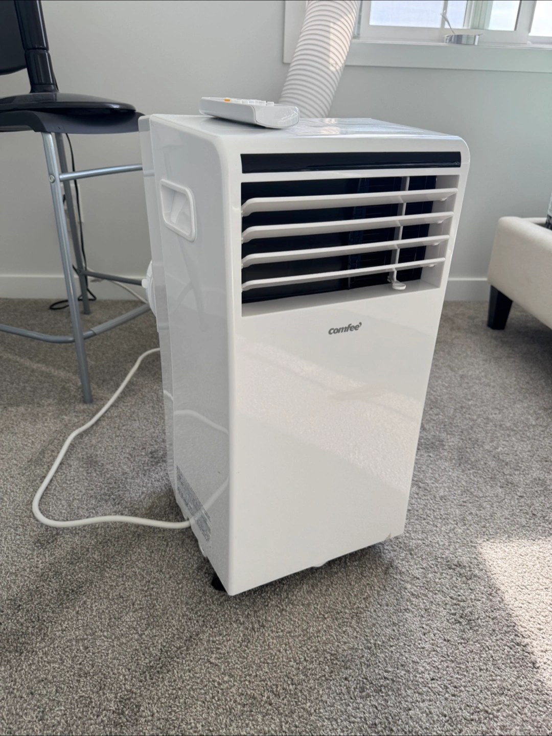 White portable air conditioner. Comes with a remote control. Includes a window kit with a flexible hose. Enjoy the cool breeze to relax during the warm weather.
