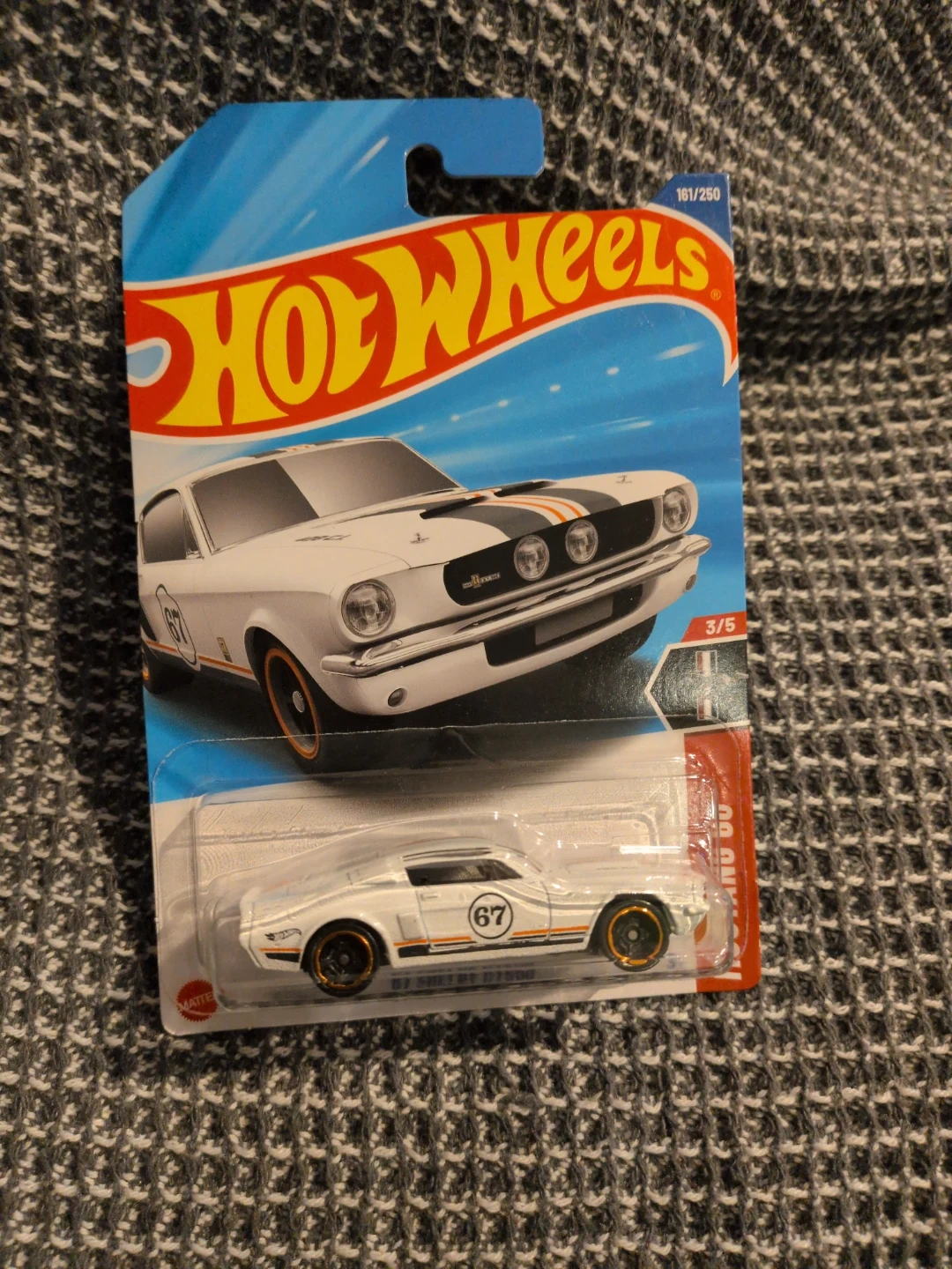 This is a new Hot Wheels 1965 Ford Mustang GT toy car. It's white with orange and black racing stripes and the number 67 on the doors. The car is still in its original packaging.