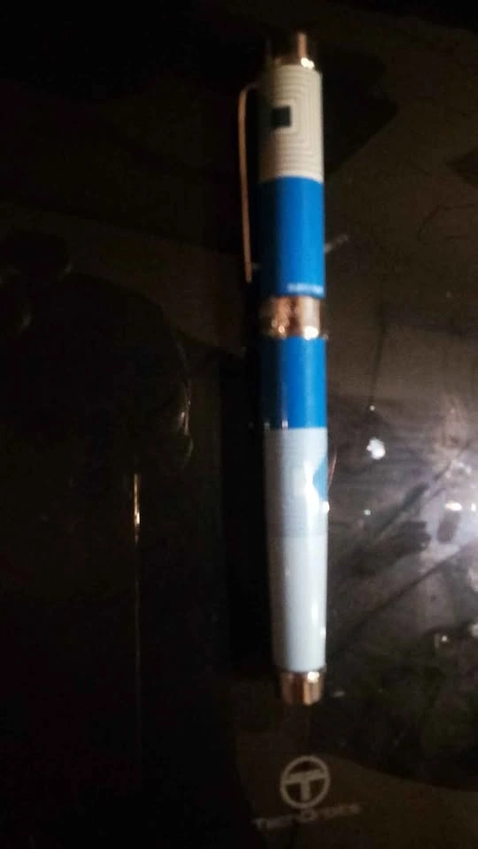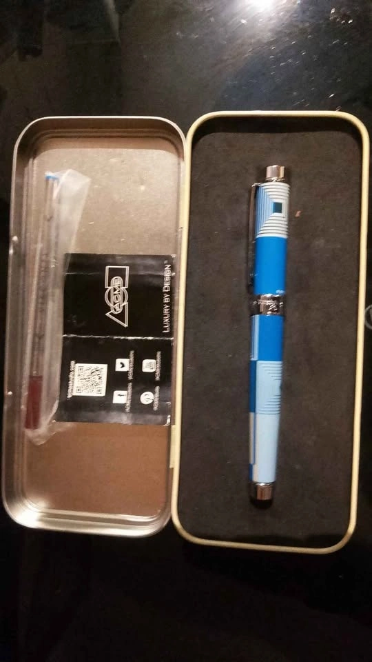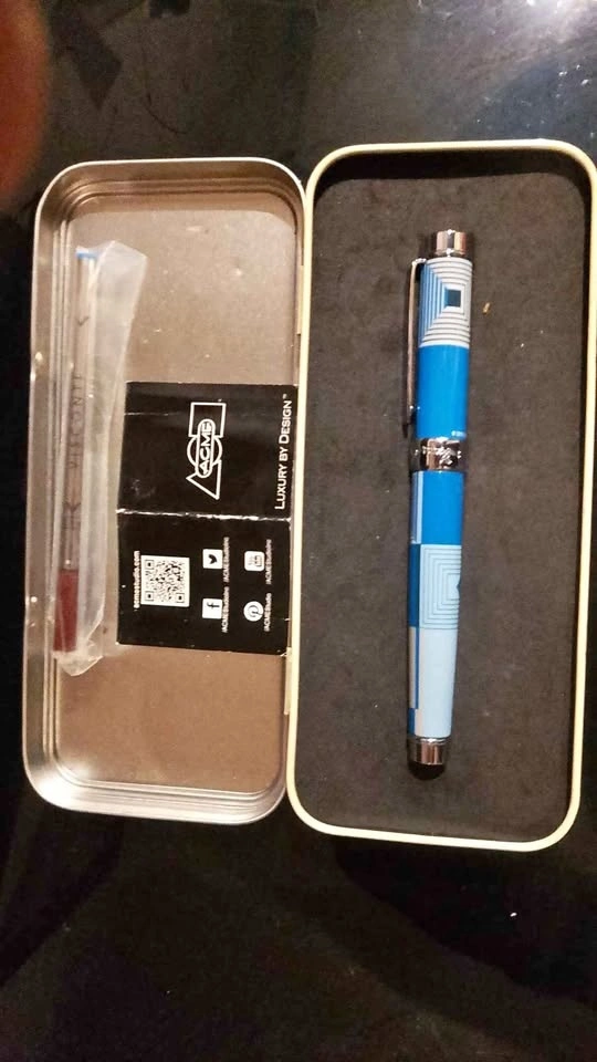 Stylish ACME rollerball pen with a blue and white geometric design. Comes with the original tin case and a refill. It looks very nice and appears to be barely used.