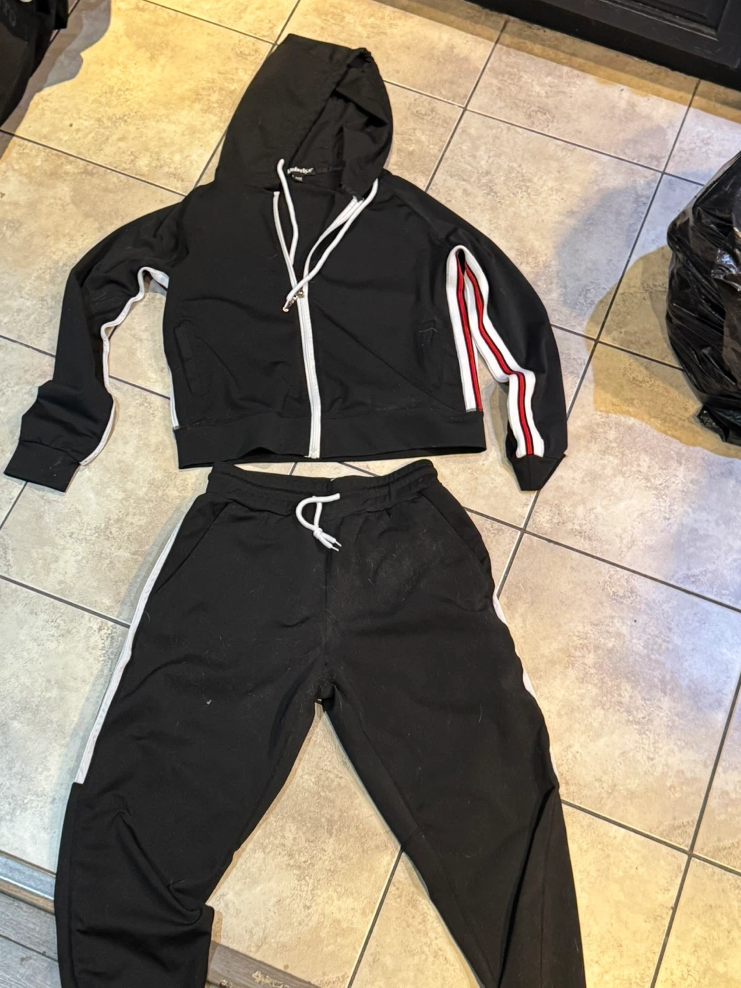 This is a black tracksuit set with white and red stripe details on the sleeves and pants. It's a two-piece outfit. The jacket features a zipper closure and a hood. The pants have a drawstring waist. This outfit is comfortable for casual wear.