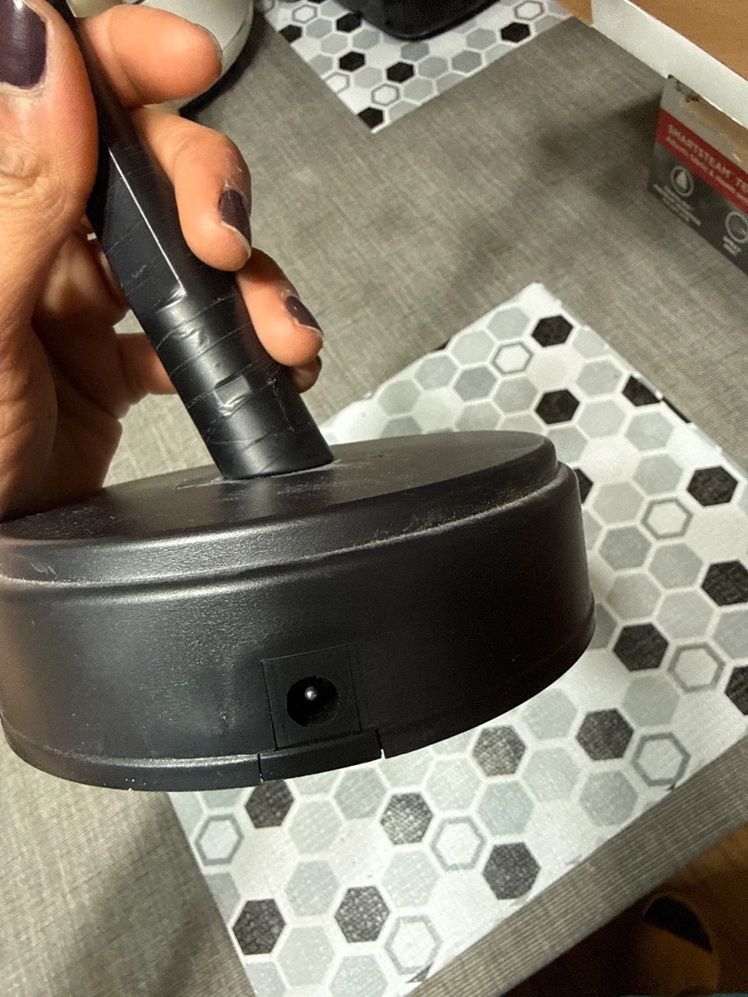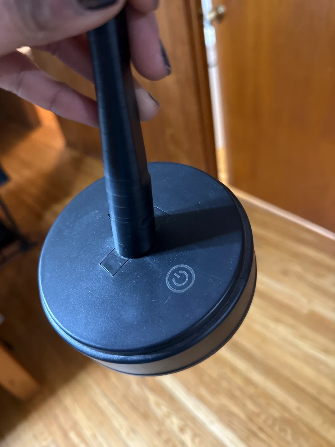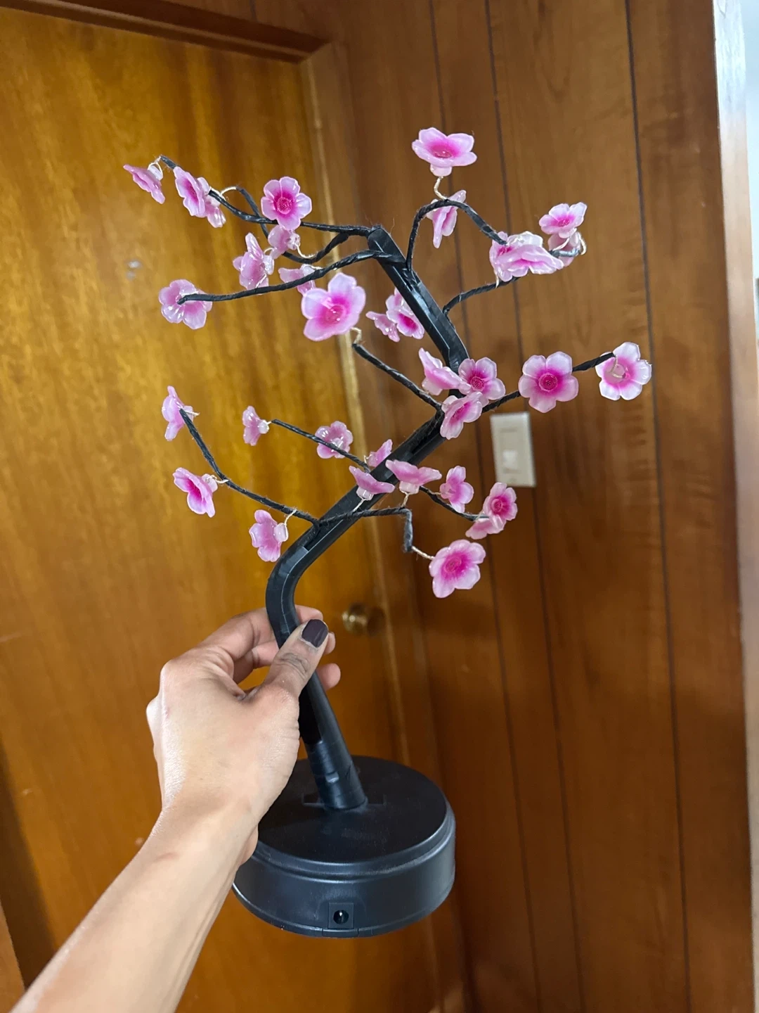 This decorative tree has a black base and trunk with pink cherry blossoms. It takes 3 AA batteries for power.