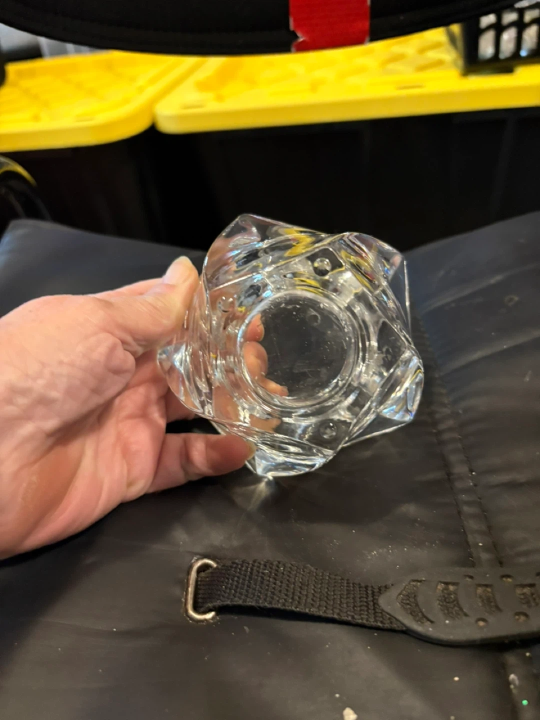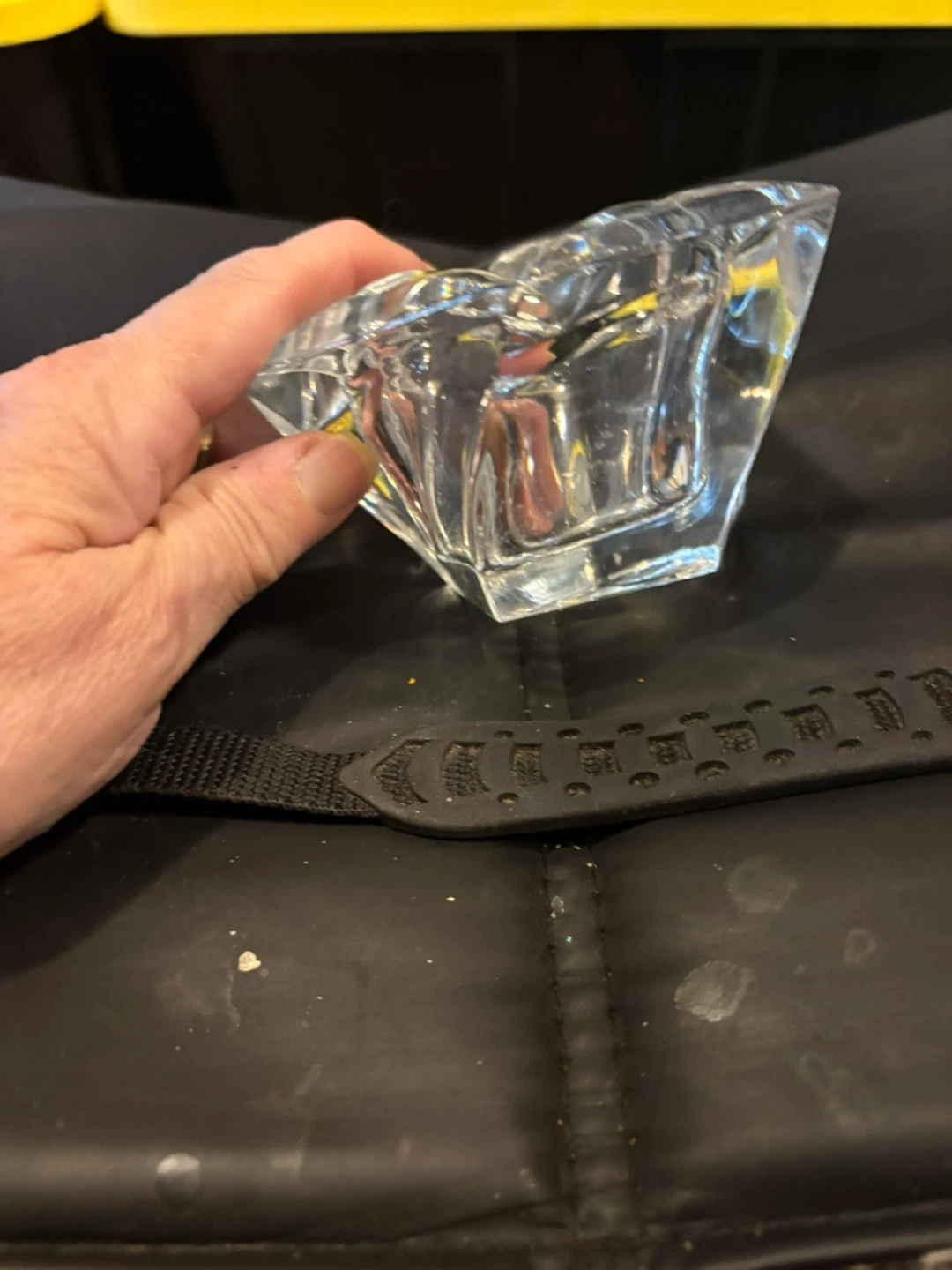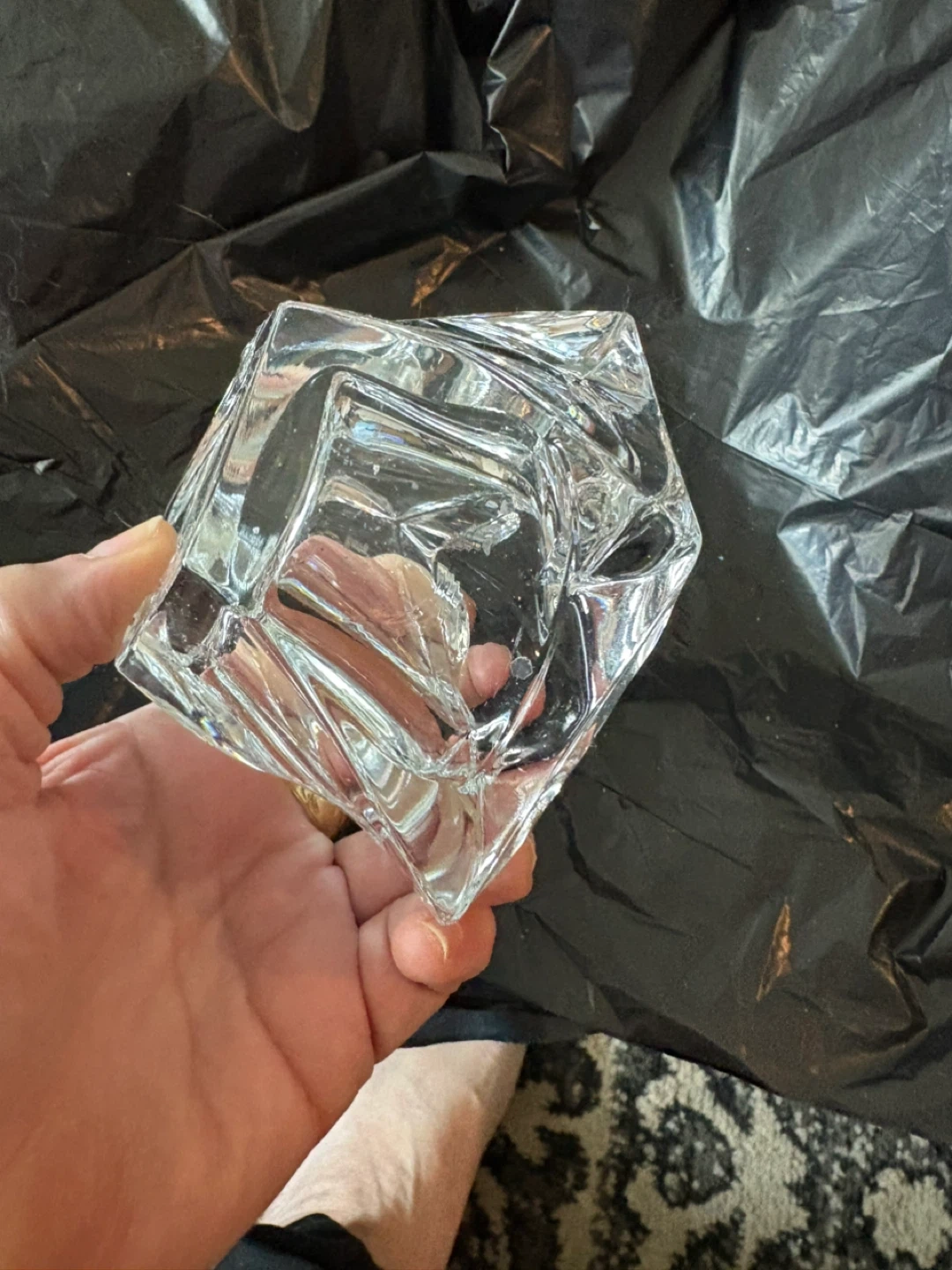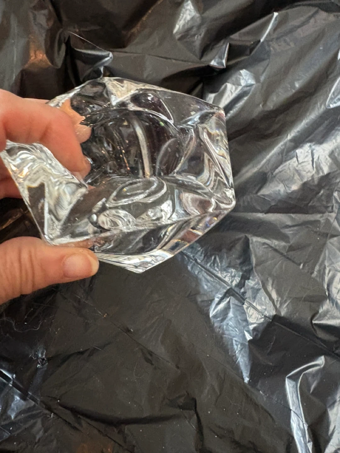 Beautiful crystal glass candlestick holder with a unique geometric design. It's perfect for adding a touch of elegance to any room or for special occasions. There are two available $35 for both or $20 each. They measure approximately 4 inches in height and width.